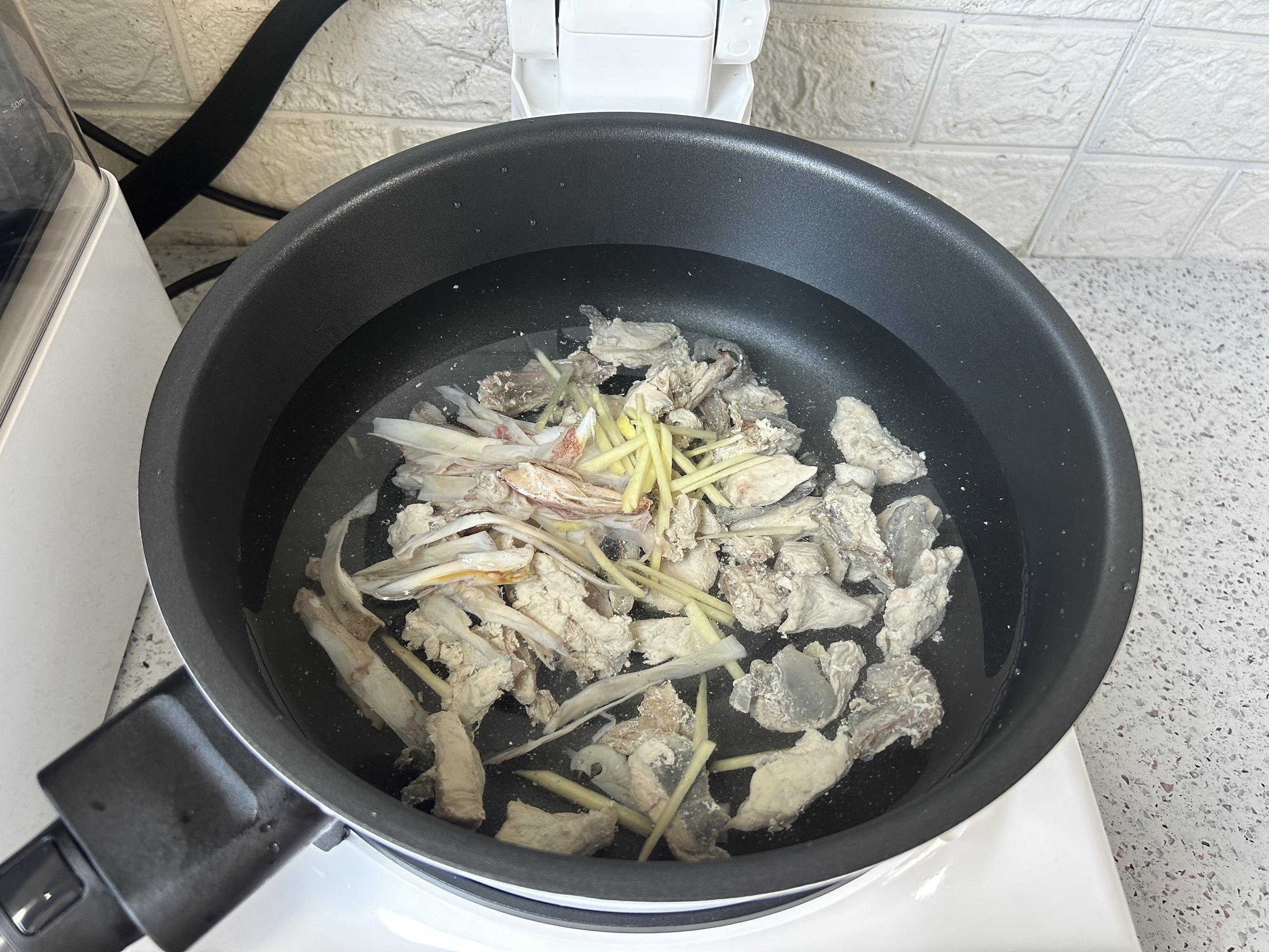 鍋裏重新換水,加入焯過水的烏雞肉、泡發的魷魚、薑絲,大火煮開5分鐘,再轉中小火燉半個小時左右。