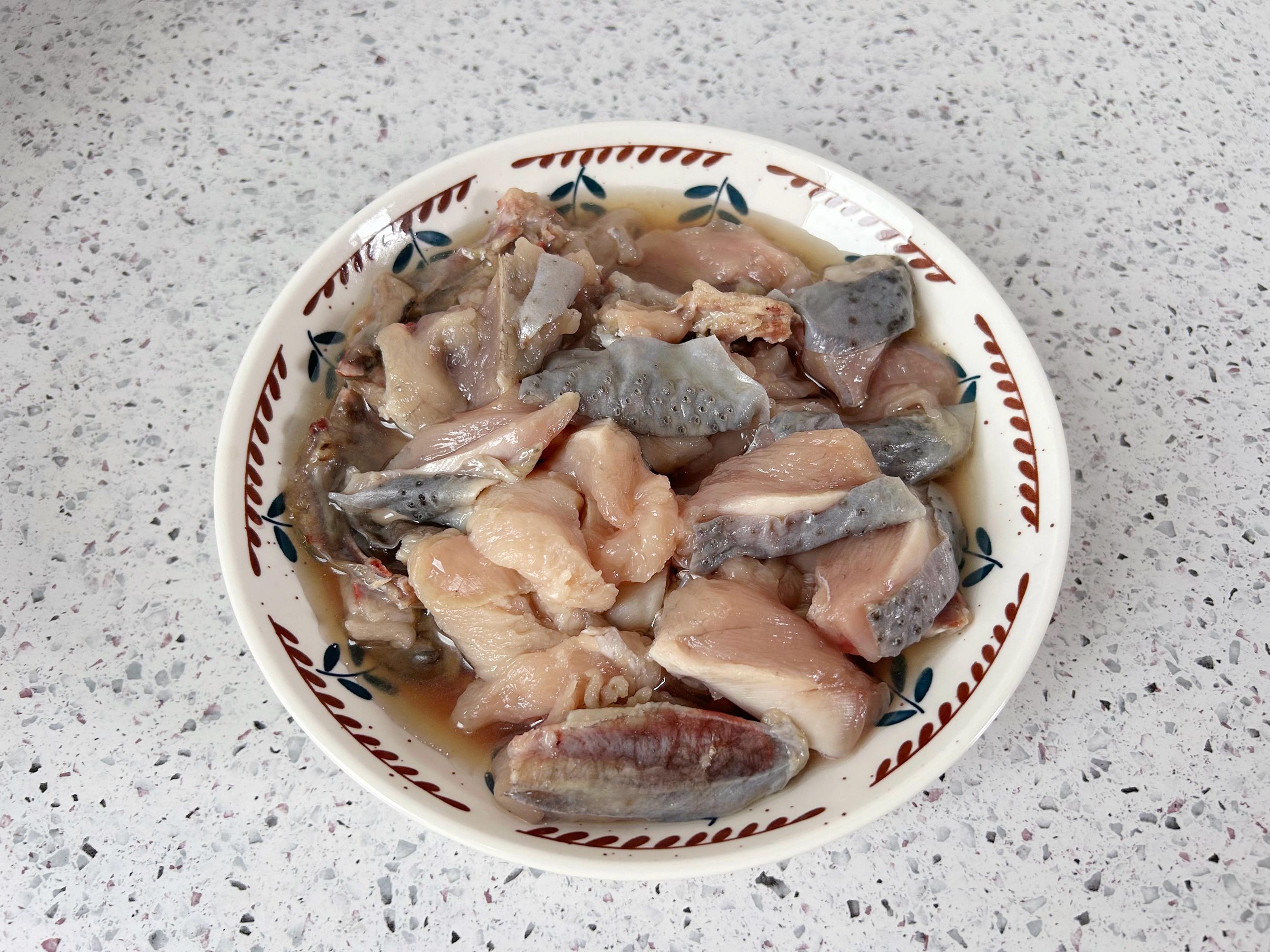 烏皮雞清理乾淨油脂,剁成小塊,加入2大勺料酒醃製10分鐘,倒掉水分。