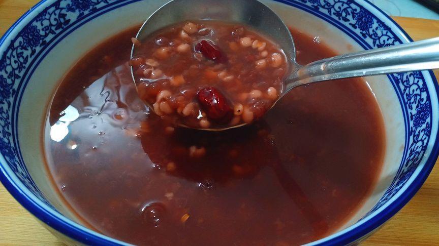2、一個小時後,鍋中的紅豆、薏米、大米已經熬製得粘稠如膠,加入紅棗和冰糖,再熬至十五分鐘,就可以出鍋了。