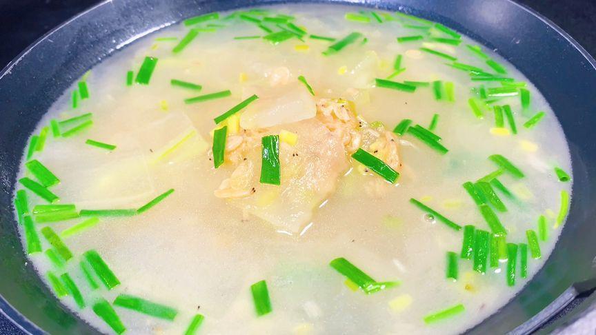 2、油熱之後,把蔥白炒香後,倒入蝦皮,開大火翻炒,倒入適量開水,有助於湯色變白,開大火把湯煮開。加入適量薑末,下入冬瓜燉煮十分鐘,加入適量的鹽,胡椒粉,雞精提鮮,用勺子翻勻,將調料化開,下入蔥葉,又濃又白又香的冬瓜湯就做好了。