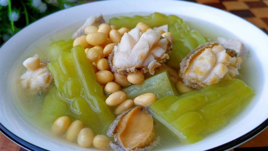 2、砂鍋裏放入洗淨的鮑魚殼,將浸泡好的黃豆倒入鍋中,再倒入一大碗清水,薑片。水開後,我們調至小火,25分鐘後,放入處理好的鮑魚,苦瓜,五分鐘後,我們加入適量的鹽和雞精調味,一鍋鮮美的鮑魚燉苦瓜湯已經完成。