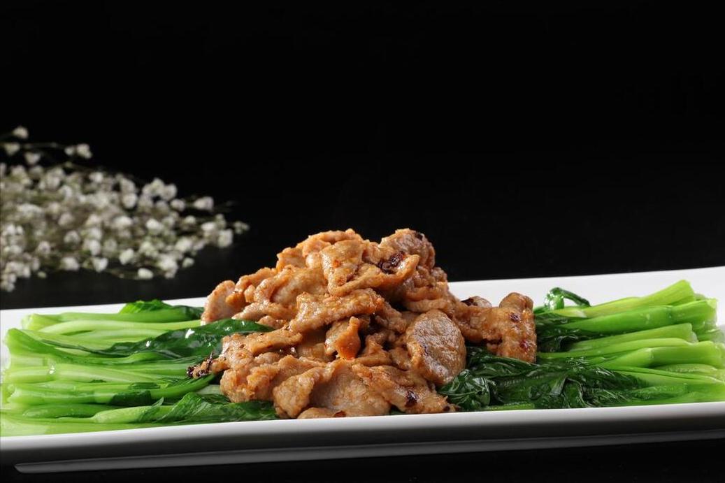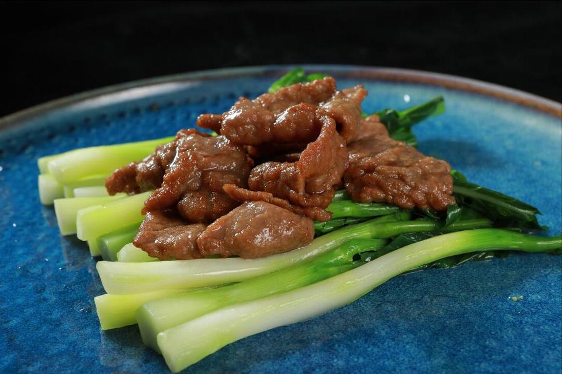 3、緊接着爆香蒜末,倒入菜心翻炒兩下,還是要保持大火,不然炒出來容易軟塌塌的。接着倒入牛肉,用生抽、蠔油、鹽、雞精調味後,用大火繼續翻炒片刻,完全炒熟後即可出鍋。