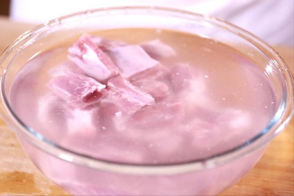 3、緊接着,再把豬骨清洗一下,洗淨以後冷水下鍋,然後加上蔥姜和料酒,來進行焯水工作。等到再次燒開之後,就可以把豬骨撈出來了,用溫熱的清水沖洗乾淨,放在一旁備用。