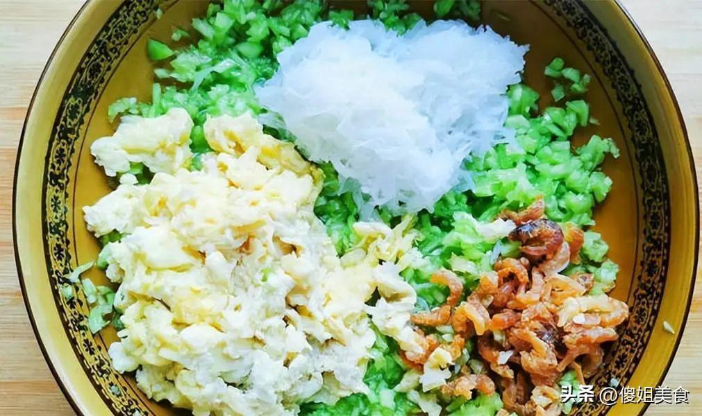 材料:餃子皮、雞蛋 2 個、黃瓜 1 根、粉絲(乾粉絲)適量、蝦仁 100 克(可選)、蔥薑蒜適量、食鹽、胡椒粉、生抽、料酒適量、芝麻油適量