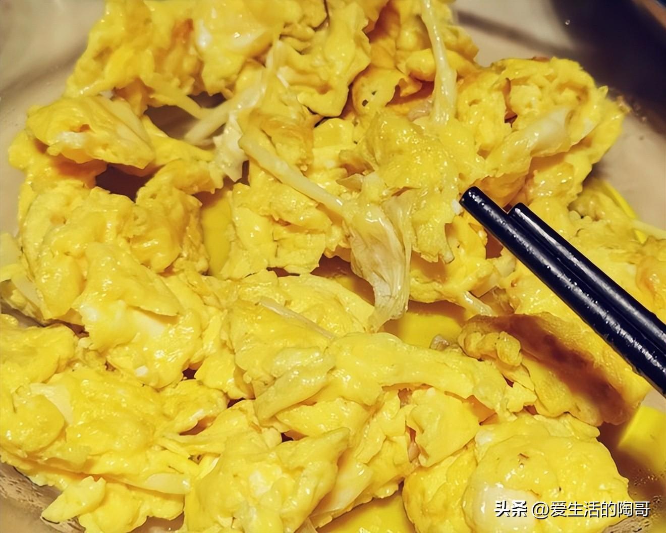 3鍋裏放油,放進生薑雞蛋液,來炒,一面炒黃後,翻面
