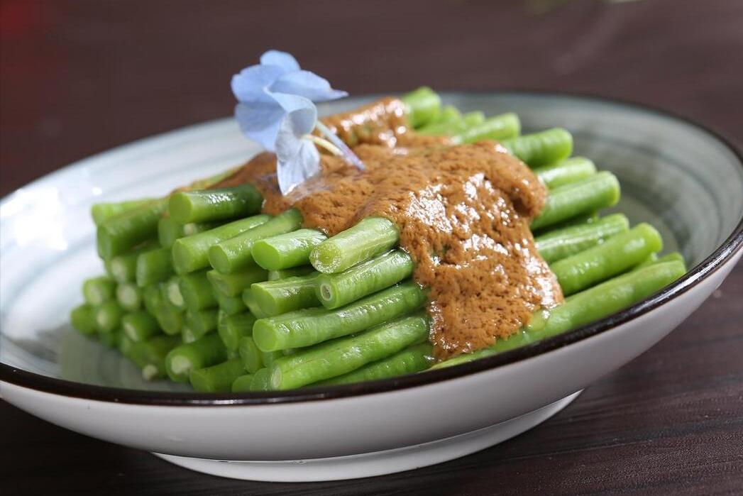 豇豆去掉頭尾,洗淨後切段,燒一鍋開水,然後來上1勺鹽,接着下入豇豆開始焯水,焯水後撈出來,擺放在盤中。準備一個小碗,加上切好的蒜末,然後來點醋、生抽、鹽、雞精、香油調味,最後來1勺麻醬,充分攪拌均勻後,澆在豇豆上即可。