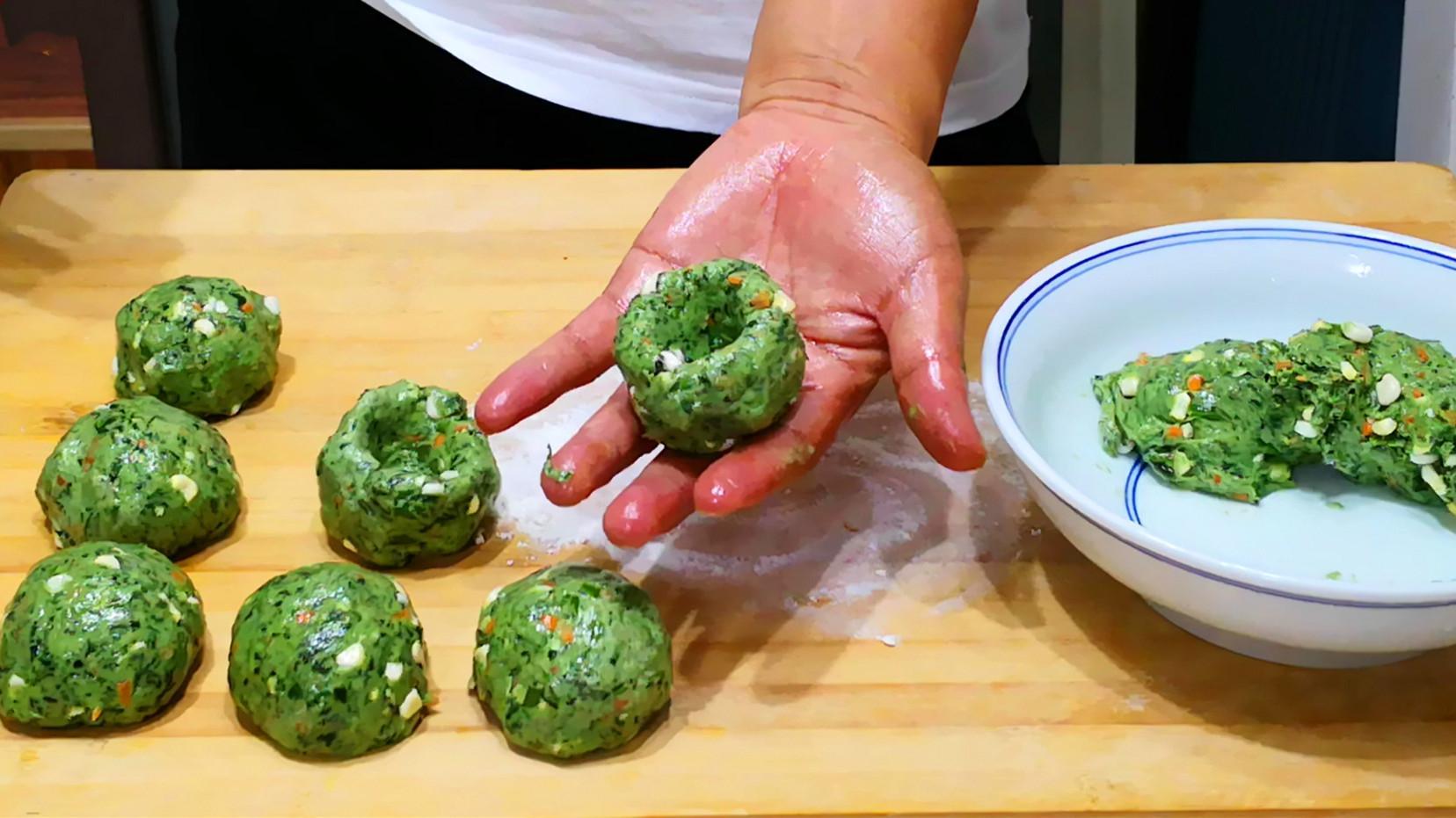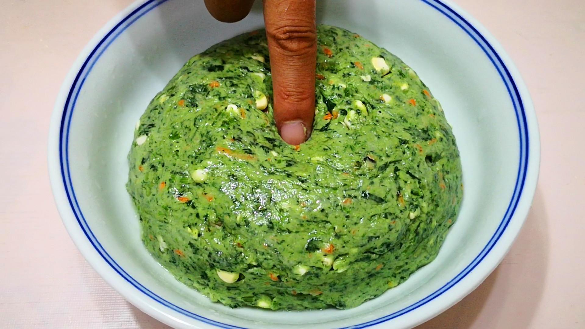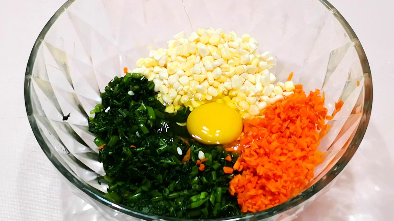 半根胡蘿蔔洗淨後先切片再切細絲,然後剁細,和玉米粒一起放到切碎的紅薯葉中,接着打入一個雞蛋攪拌均勻。然後取適量的細玉米麪和黃豆麪粉(比例大約爲1:1),攪拌均勻後倒入紅薯葉中,一邊倒一邊用筷子攪拌,攪拌至乾溼合適時,再下手將它們揉到一起,揉至表面光滑後,再用刷子在其表面刷一點點油,蓋上一層保鮮膜醒發15分鐘備用。
