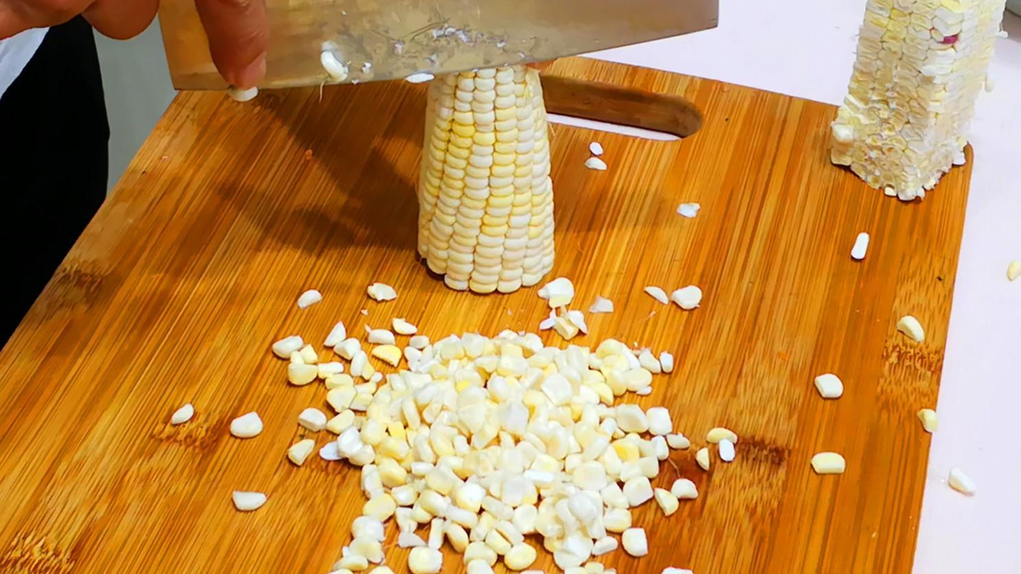 2.然後取一根鮮玉米,用手剝下玉米粒,或是用刀將玉米粒切下來備用;