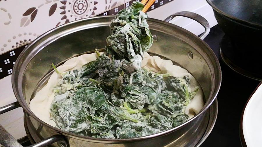 3.鍋中加水,在蒸屜中鋪上一層打溼的籠布,大火燒開後,再把紅薯葉抖散擺入蒸屜中,蓋上鍋蓋開始蒸。