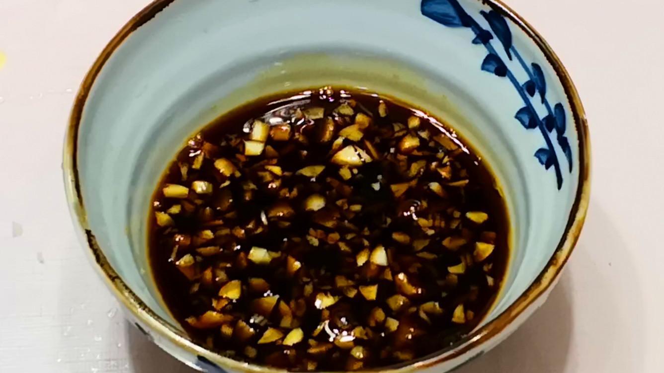 5.趁蒸紅薯葉的時間,我們再來準備個蘸料:大蒜適量拍扁剁細放入小碗裏,然後再加入半勺白糖、一勺米醋、2勺味極鮮和少許香油,充分攪拌均勻後備用。