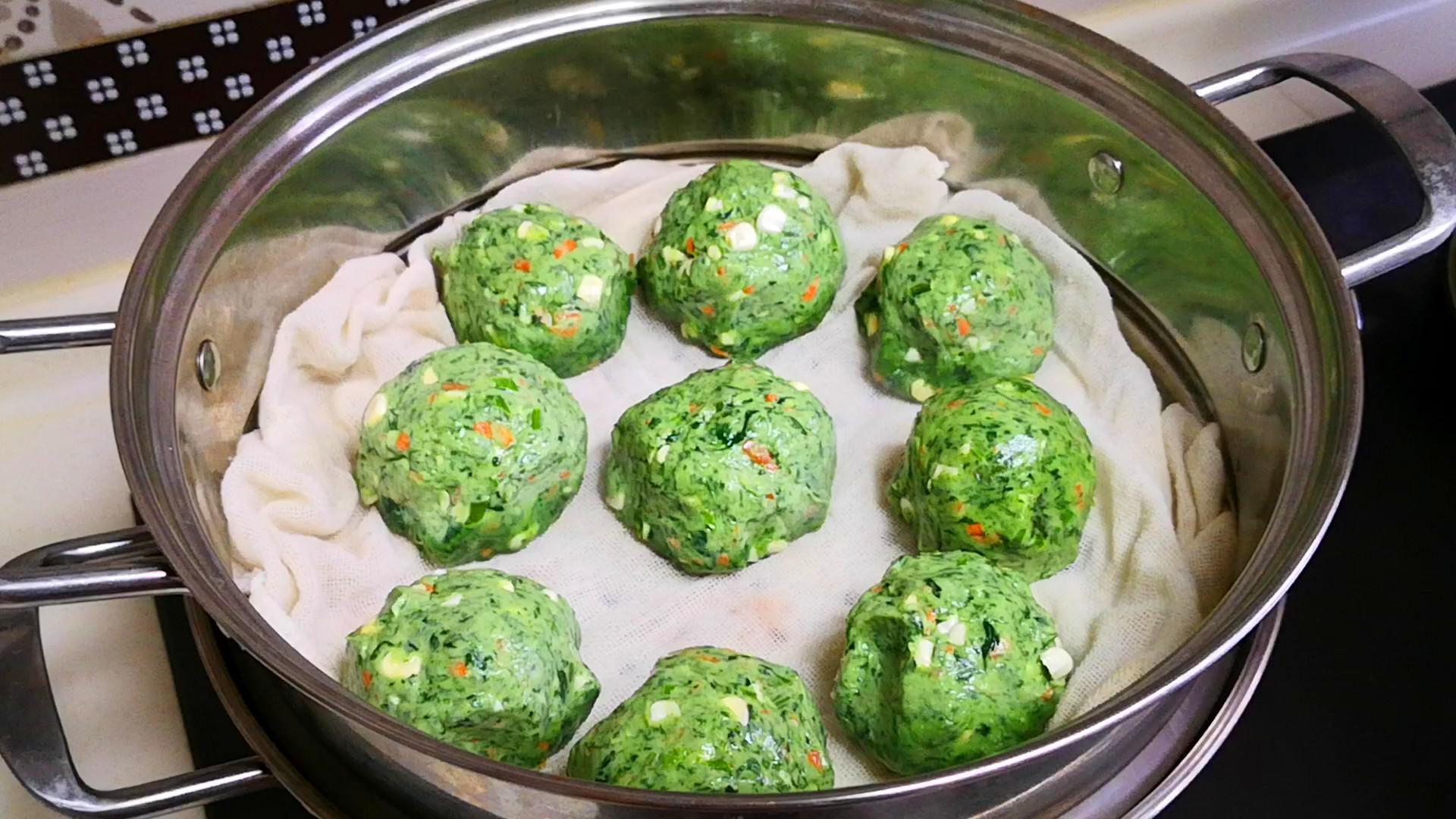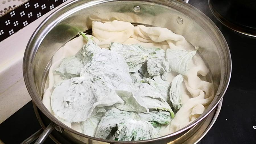 4.起鍋加足夠量的水,放上蒸屜,在蒸屜中鋪一層用水打溼的墊布,燒開後再把紅薯葉窩窩頭擺入,蓋好鍋蓋繼續蒸,燒至鍋開始冒氣後再繼續蒸15分鐘左右。