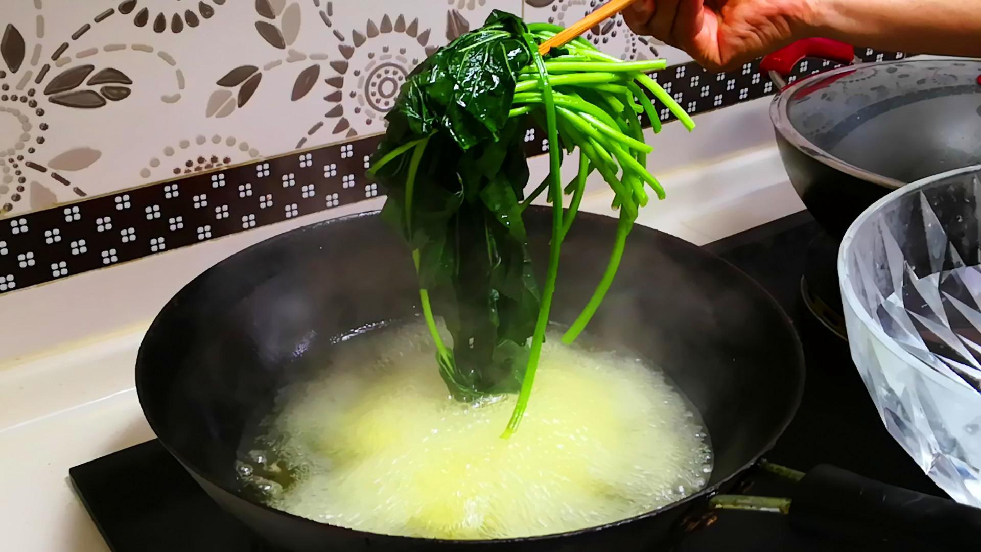 1.先把紅薯葉清洗乾淨,提前燒一鍋開水,放入紅薯葉焯燙一下,焯水時少加一點鹽和食用油,可以使紅薯葉顏色保持翠綠。