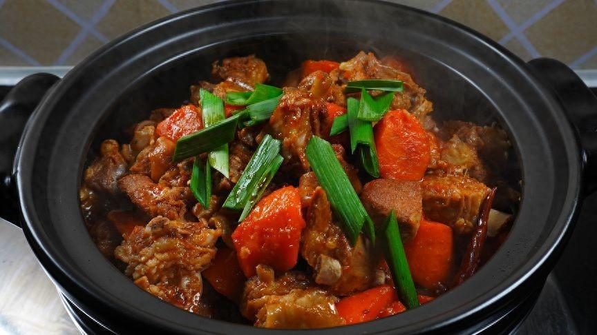 2、熱鍋放油,下入薑片炒香,倒入羊肉大火炒出水分,再加高度白酒收幹水分,然後倒入配好的香料炒香,炒至羊肉微微變黃,倒入清水,沒過羊肉,然後下入山楂、大蒜子。白胡椒粒,大火煮開後,小火燜煮一個小時,煮至羊肉軟爛,湯汁變黃,下入胡蘿蔔塊,加食鹽、冰糖,繼續燜煮25分鐘,然後大火收濃湯汁,最後撒上青蒜苗,一道紅燜羊肉就做好了。