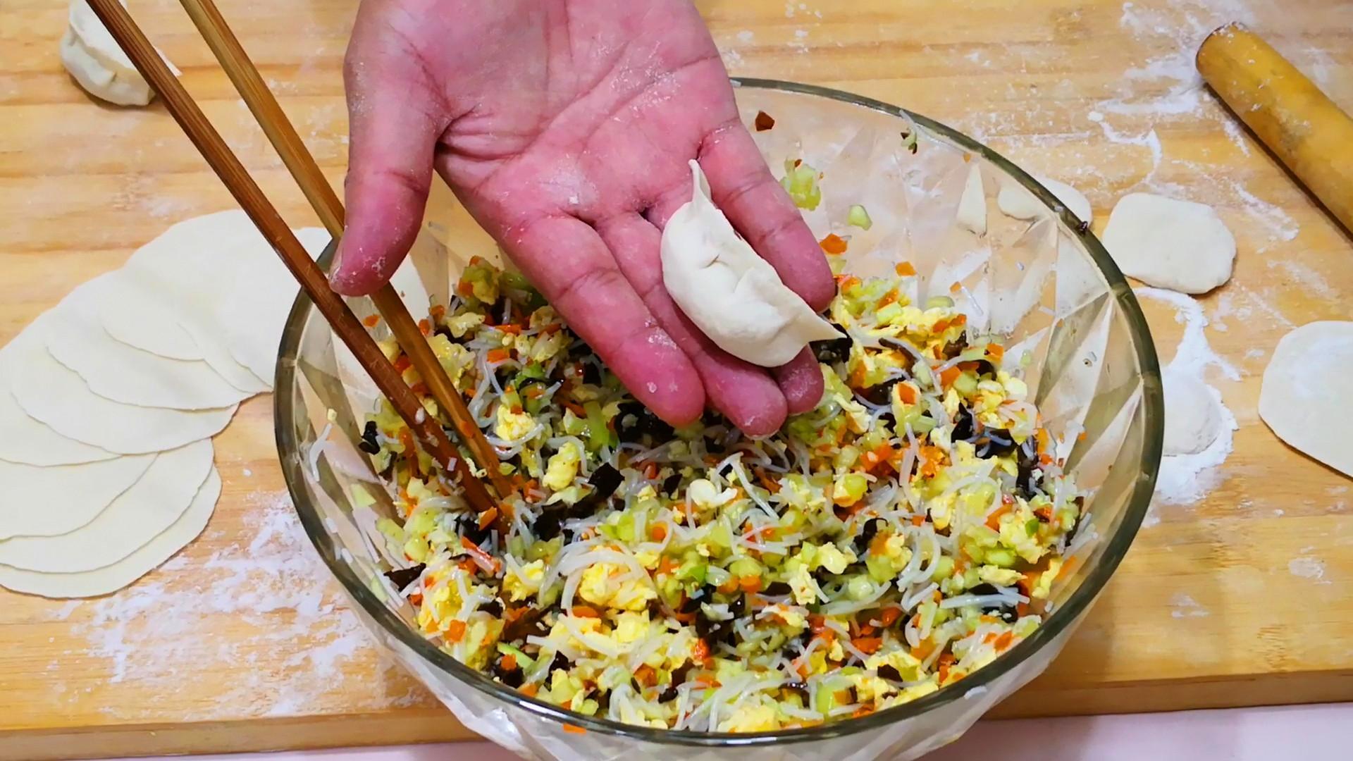 【絲瓜餡餃子】一條絲瓜清洗乾淨後先去頭去尾,然後用打皮刀削去外皮,接着先切片再切丁,放入大碗中,加入1勺鹽,攪拌均勻後醃製10分鐘,剎一下絲瓜裏的水分;胡蘿蔔用擦板擦成絲後再剁碎,木耳焯水後先切絲再剁細,粉絲用熱水泡軟後切細,蔥切蔥花備用;雞蛋打散後,煎成大小均勻的雞蛋碎後盛出備用;最後把擠幹水分的絲瓜餡裏倒入切好的胡蘿蔔丁、木耳、粉絲、雞蛋碎和蔥花,再調一下味:加入適量鹽、胡椒粉、熟油、再滴入幾滴香油攪拌均勻,好喫的絲瓜餃子餡我們就調好了。