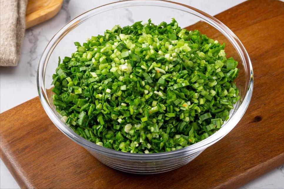 4、把韭菜摘洗乾淨,切碎以後,不要直接倒在肉餡裏,不然容易出水,因此接下來我們還需要多做1步。往韭菜中,倒入適量的香油,充分攪拌好以後,再倒入肉餡中,就可以避免出水的情況了,因爲韭菜上面包裹了一層油膜。