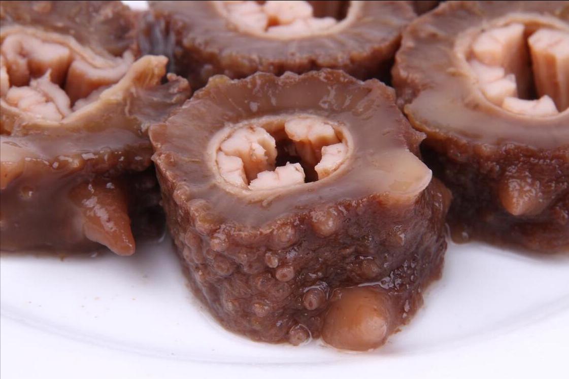 4、然後將裏面白色的東西,還有海蔘的牙齒什麼的都去掉,緊接着我們還可以看到,海蔘內側部分,有白色的條紋,這是海蔘的筋,最好用剪刀割成幾段,這樣後續泡發效果會更好。