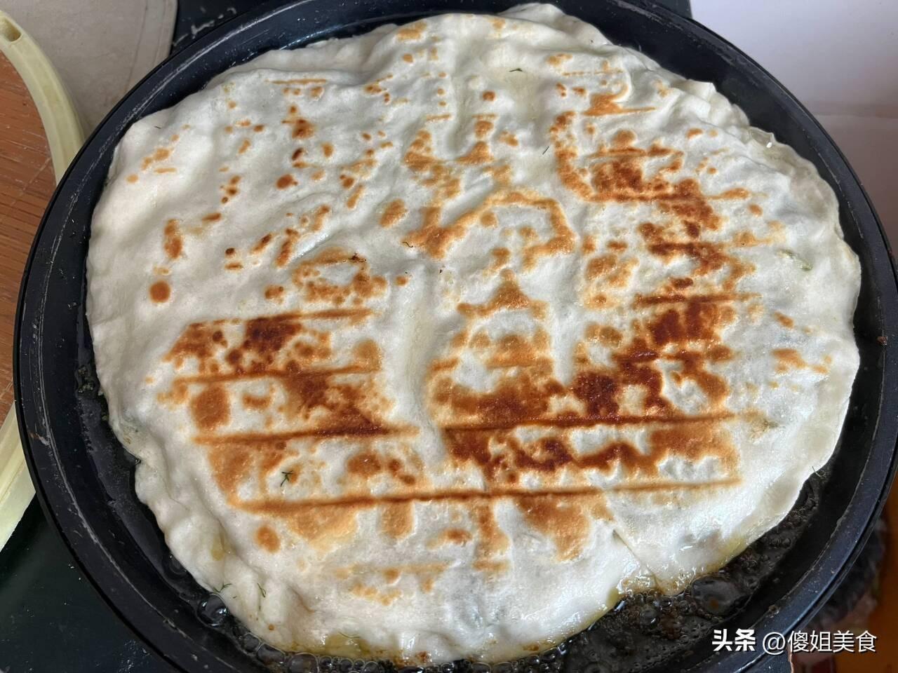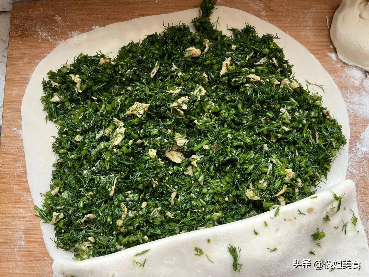提前和一個軟硬適中的麪糰,和好後放在案板上使勁的揉搓幾下,分成小面劑子,最後擀成薄薄的麪皮,把和好的菜餡放上去攤均勻,然後上面再蓋一層薄面皮,收好口不要漏菜餡。