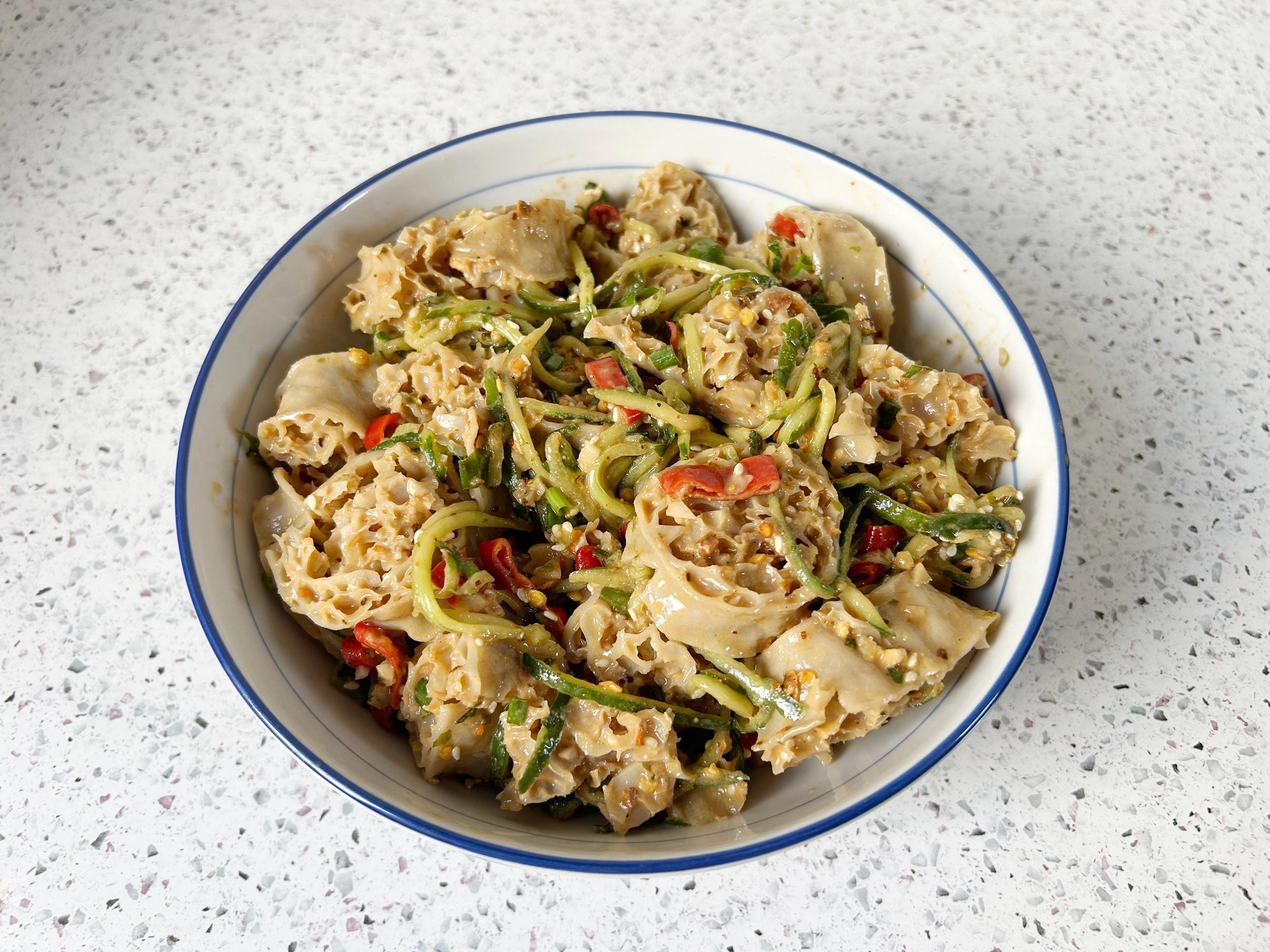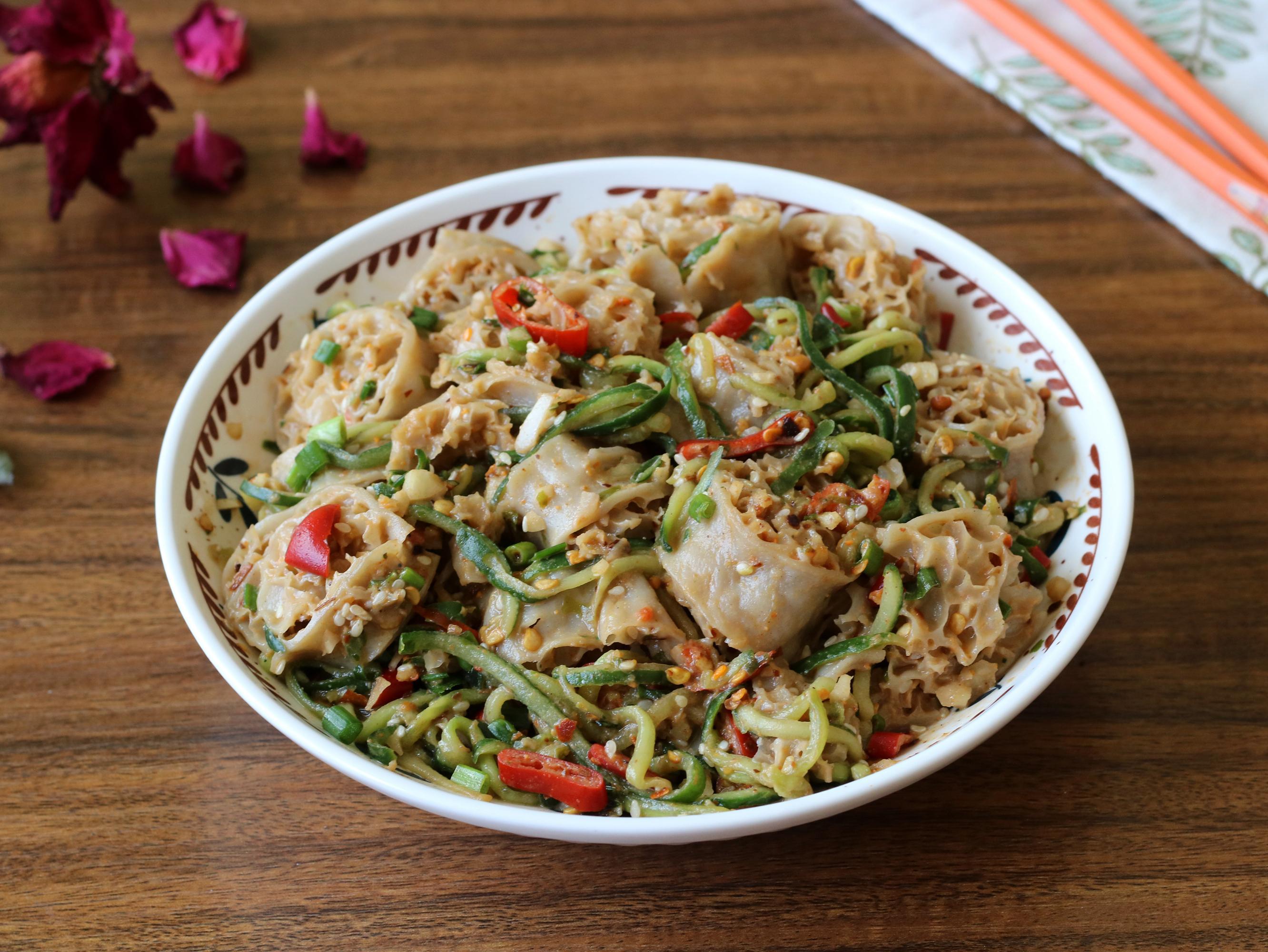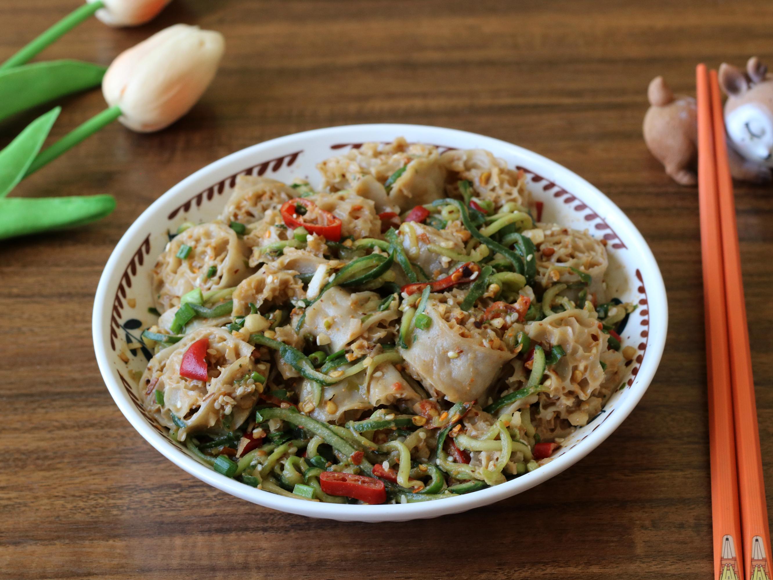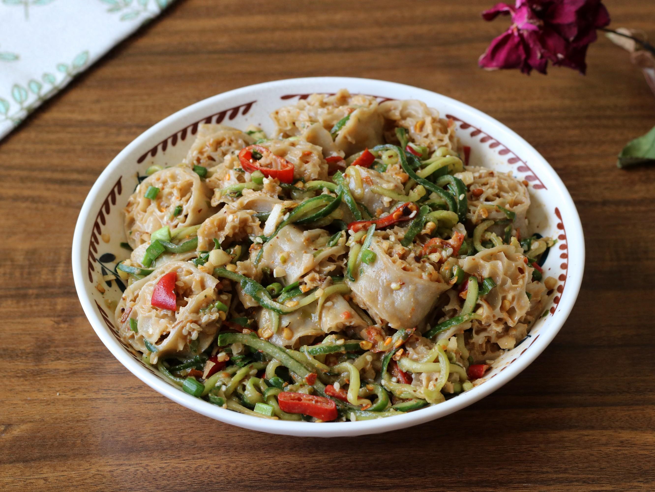 找一個大一點的深碗,把泡發的面藕、黃瓜和泡椒簡單混合均勻,倒入調好的芝麻醬翻拌均勻,撒上白芝麻,一碗營養好喫的芝麻醬拌麪就做好了。