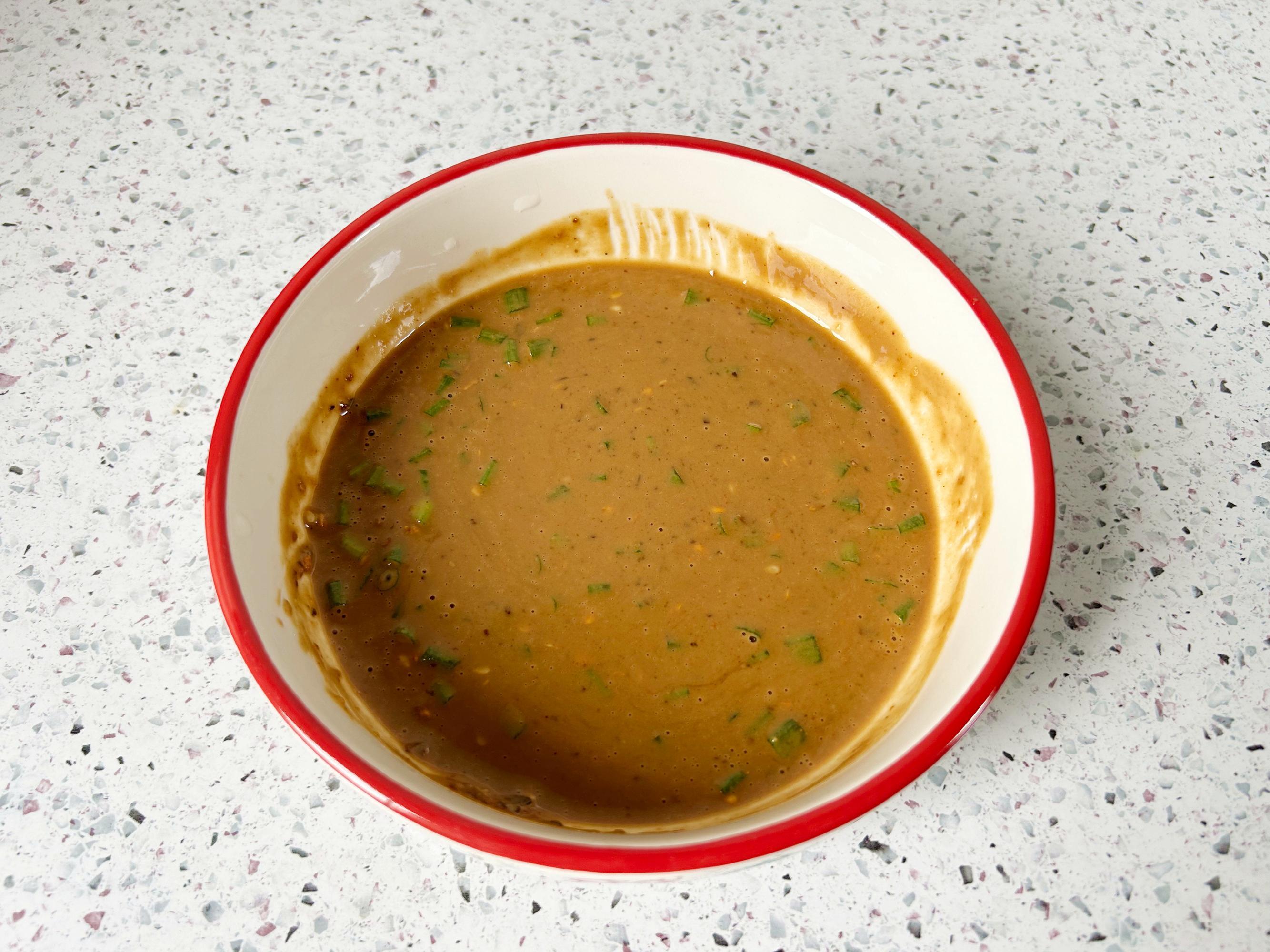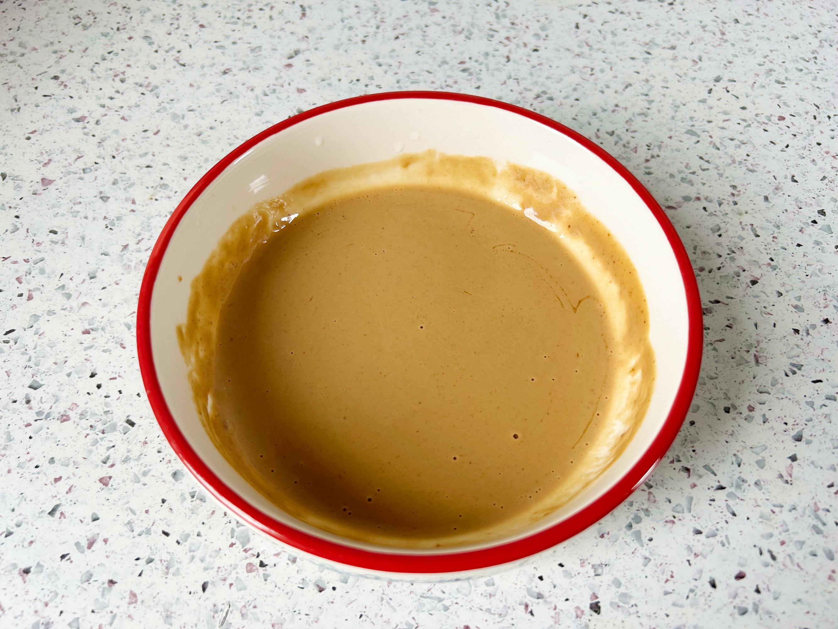 芝麻醬加少量的水,稀釋成酸奶的濃稠度,我用的是熱乾麪裏面配的芝麻醬。