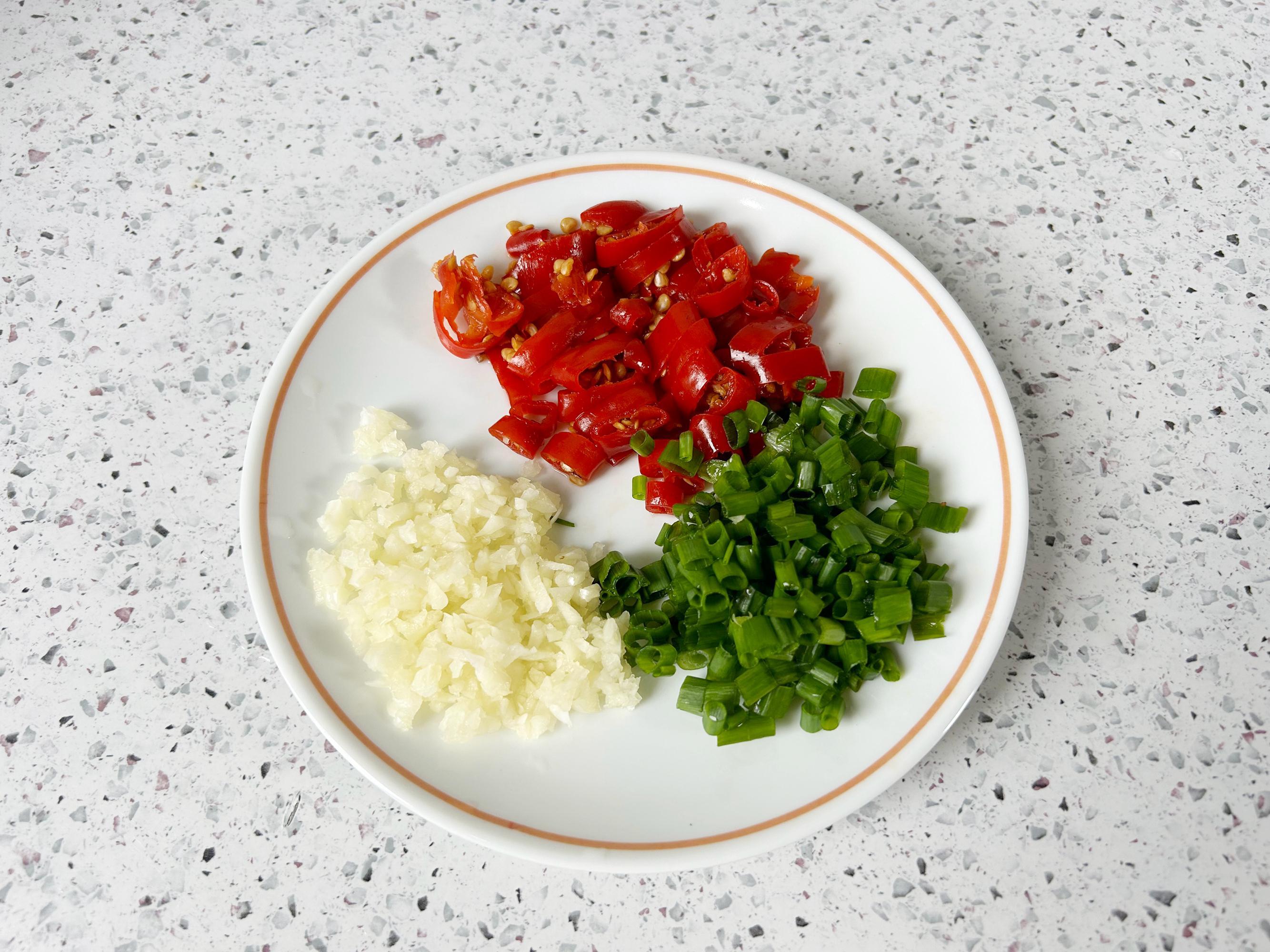 泡麪藕的同時,把紅泡椒切成小段,獨頭蒜拍扁去皮,切成蒜末,香蔥只要葉子部分,切成顆粒。