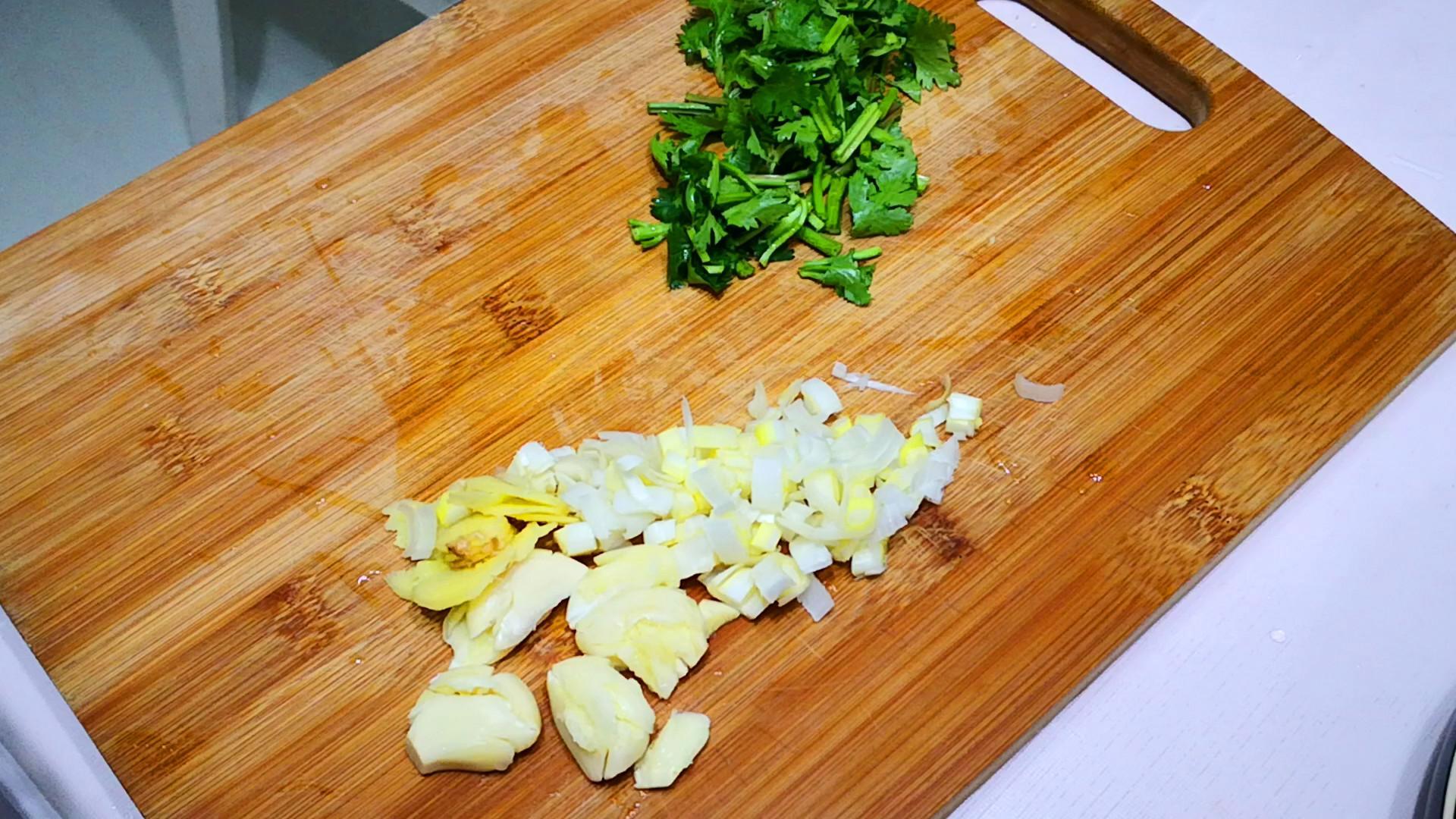 3.趁醃製的時間,我們再來準備配料:一塊生薑去皮後切成薑片;幾瓣大蒜拍扁;兩根香菜切成段;兩棵小蔥切成蔥花備用。