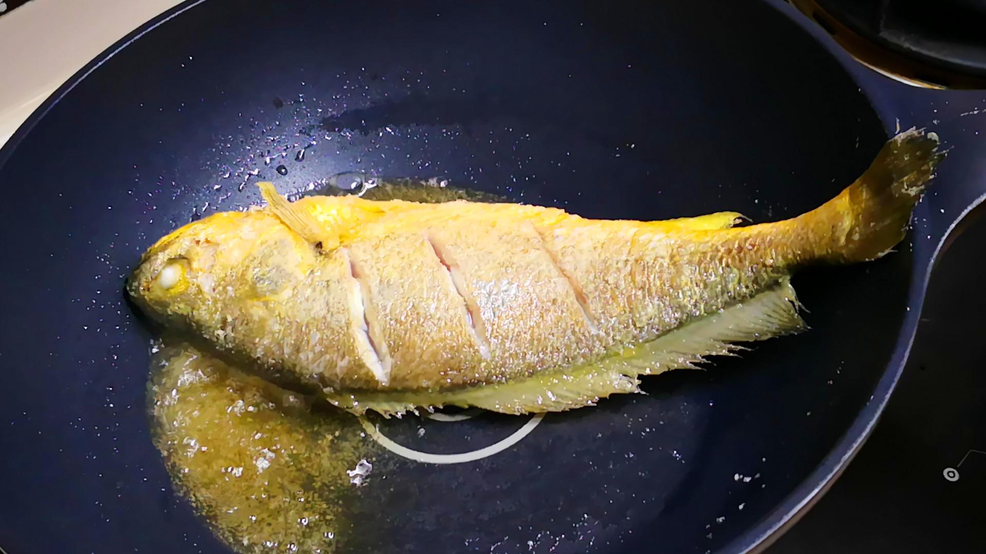 起鍋加適量的油潤一下油,燒至油熱後下入黃花魚,煎至一面定型後再翻面,煎至魚的兩面都呈金黃色時關火,將魚盛入盤中備用。