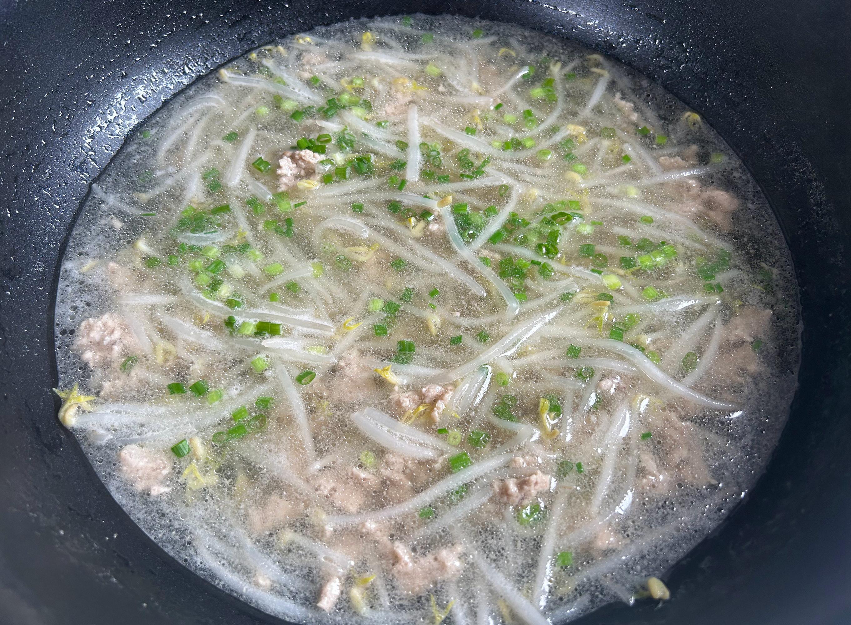 放入綠豆芽燙到斷生,加適量的鹽調味,撒上香蔥,用湯的溫度燙熟,一道營養好喝,清爽不油膩綠豆芽肉末湯就做好了。從準備食材到做好出鍋,一共才幾分鐘,特別的省事。