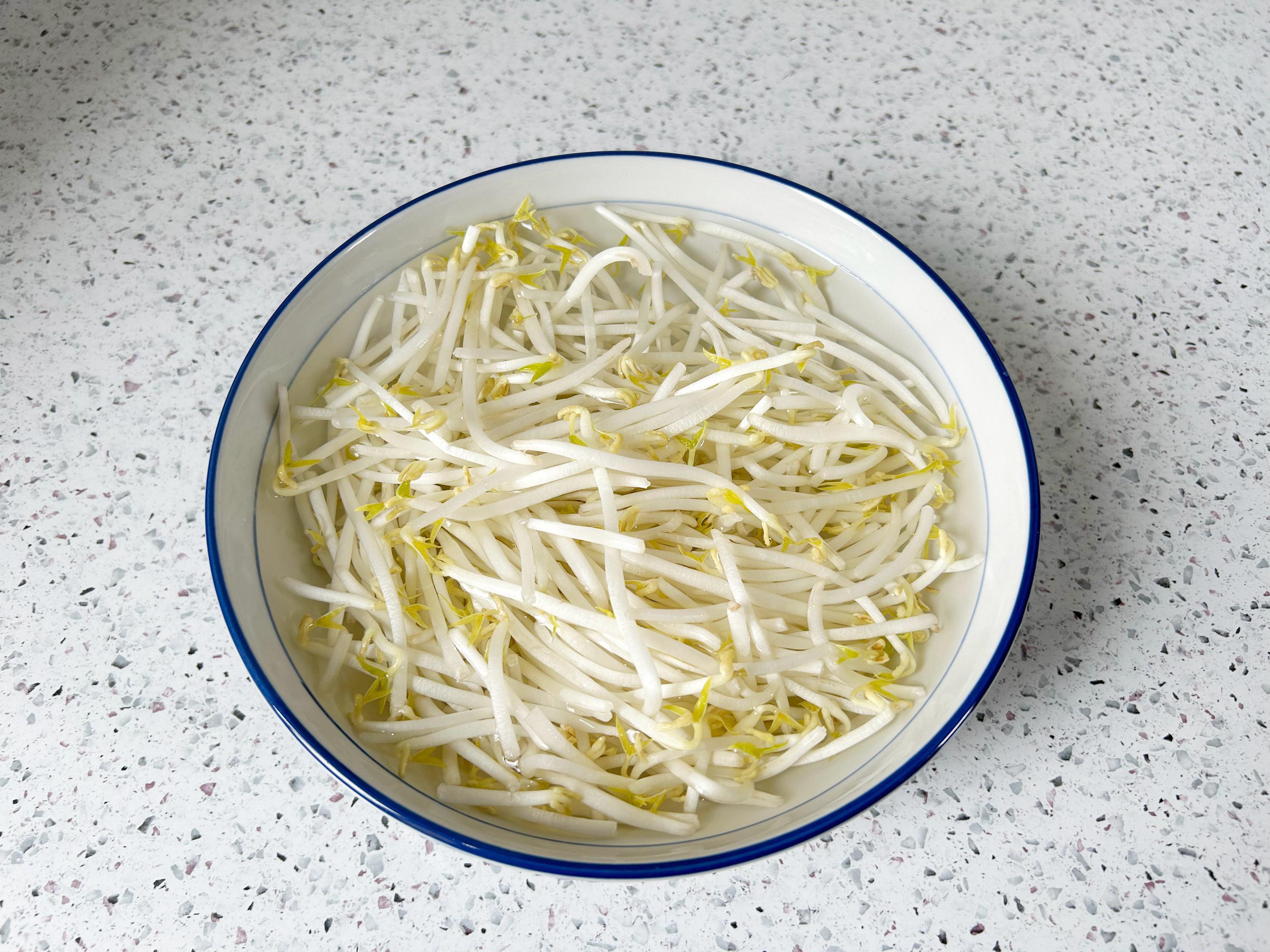 綠豆芽清洗乾淨,挑出綠色的外皮,瀝乾水分備用。