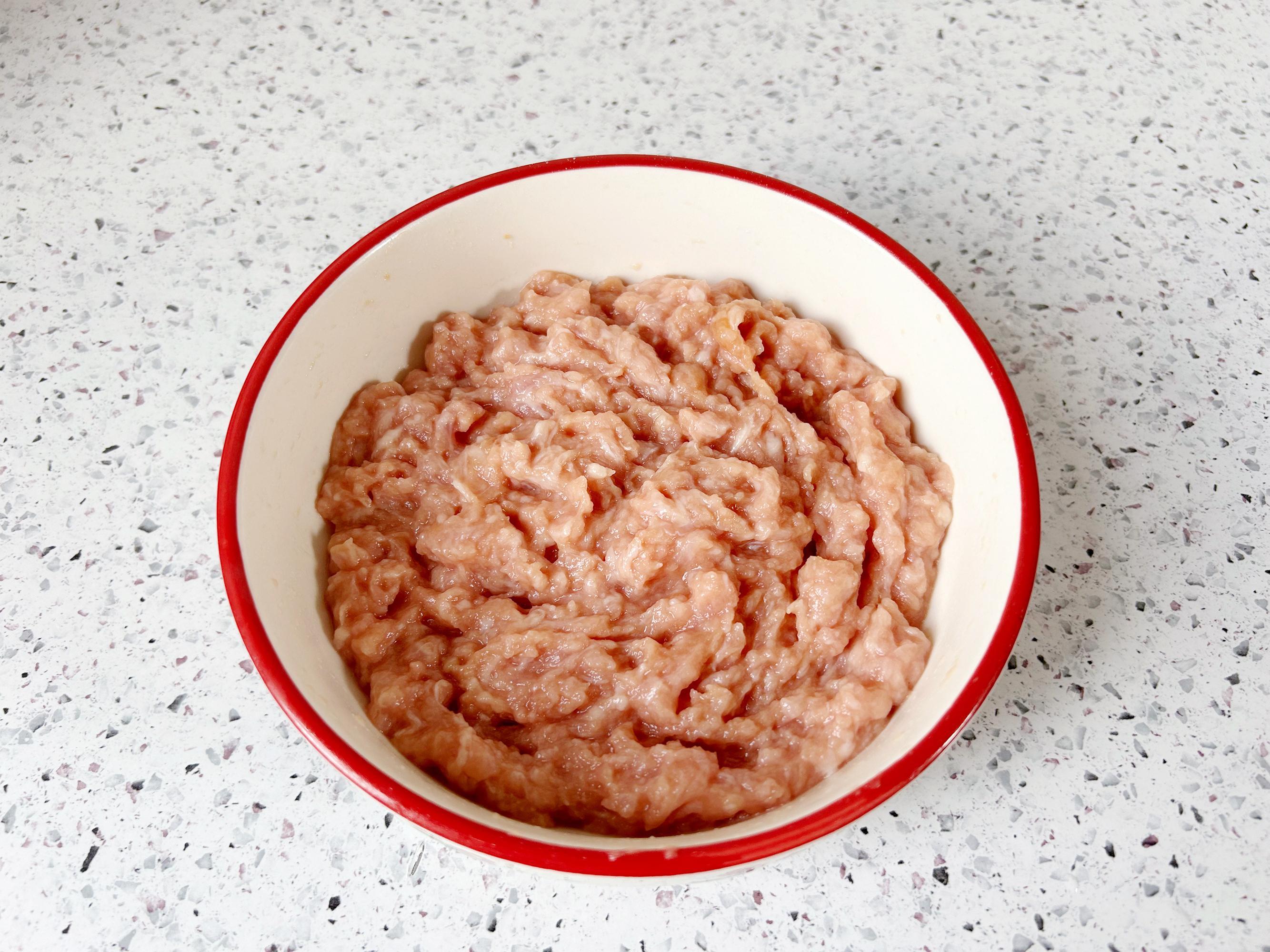 豬肉清洗乾淨,切成薄片,放入絞肉機裏打成肉末,加入玉米澱粉、生抽混合均勻,加少量的水攪拌到肉餡吸收,這樣炒出來的肉末不會老,這裏是2個菜用到的肉末。
