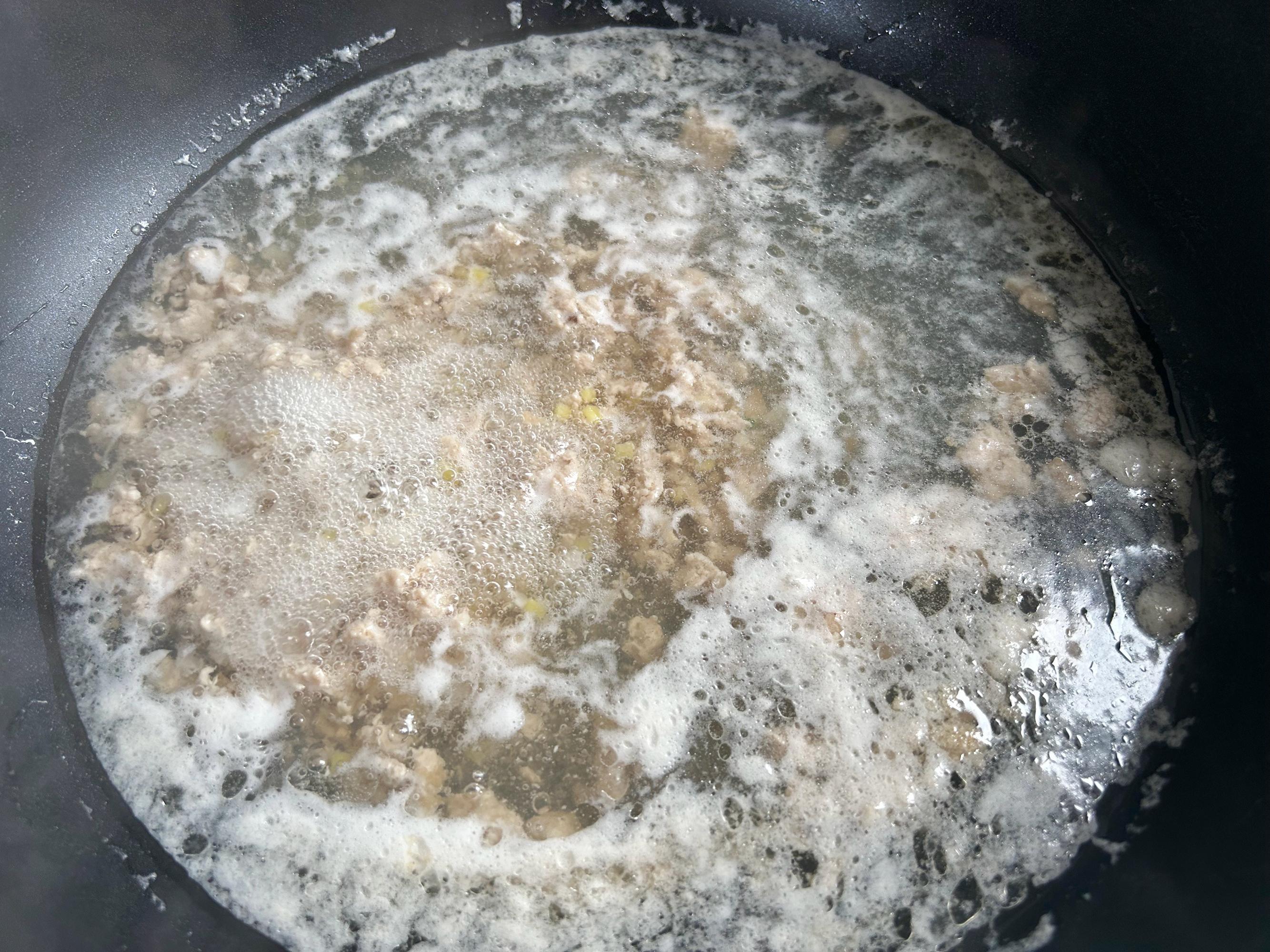 加入2碗水,大火煮開,浮沫多的話,用勺子撇出來。