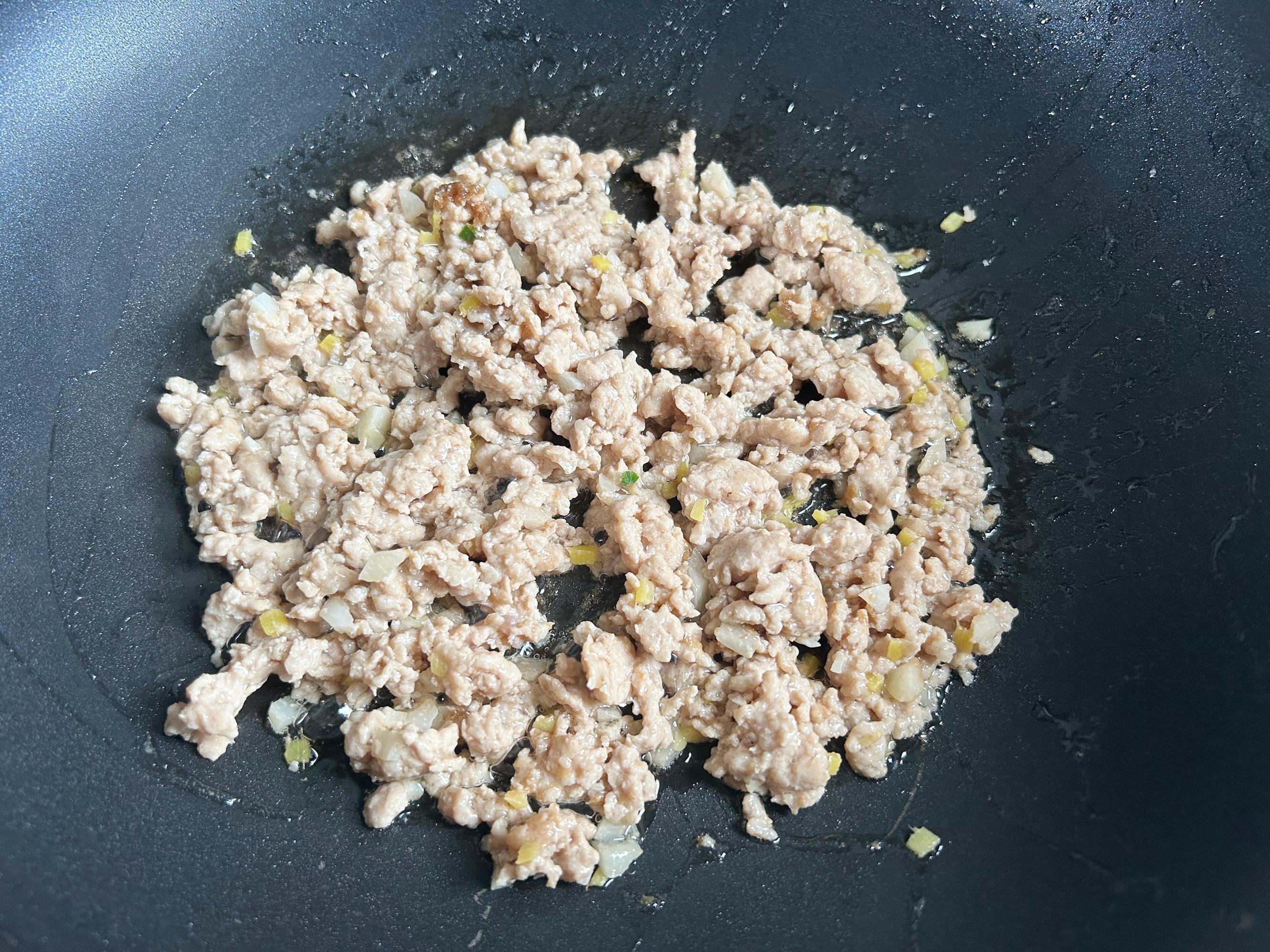 熱鍋放油,放入薑末和蒜末翻炒出香味,加入肉餡翻炒到熟透。