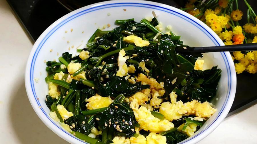 4.最後將雞蛋碎、涼拌汁全都倒入到紅薯葉中,用筷子攪拌均勻後裝盤即可。三伏天來上這麼一盤涼拌紅薯葉,清新爽口又解饞!