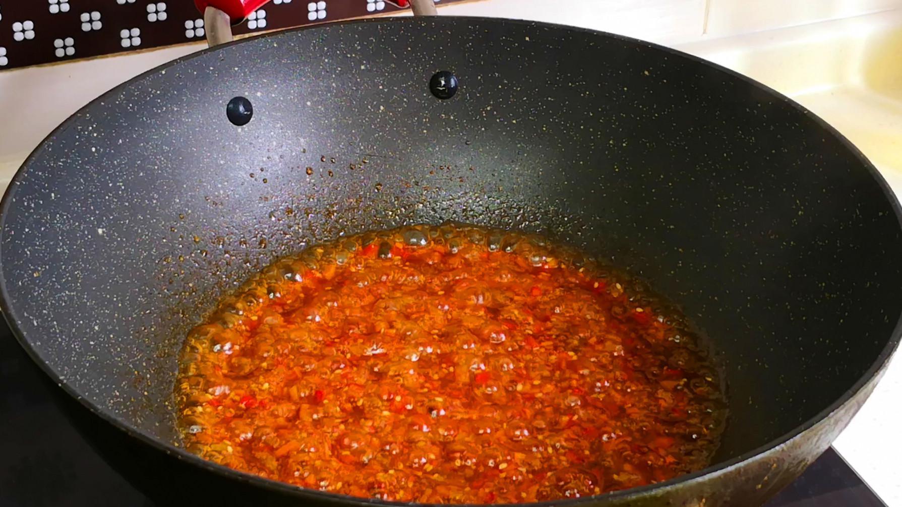 6.起鍋燒油,下入胡蘿蔔丁和紅椒丁,翻炒片刻後再倒入調好的料汁,繼續燒至湯汁粘稠後,撒上一把芝麻,攪拌均勻後關火。