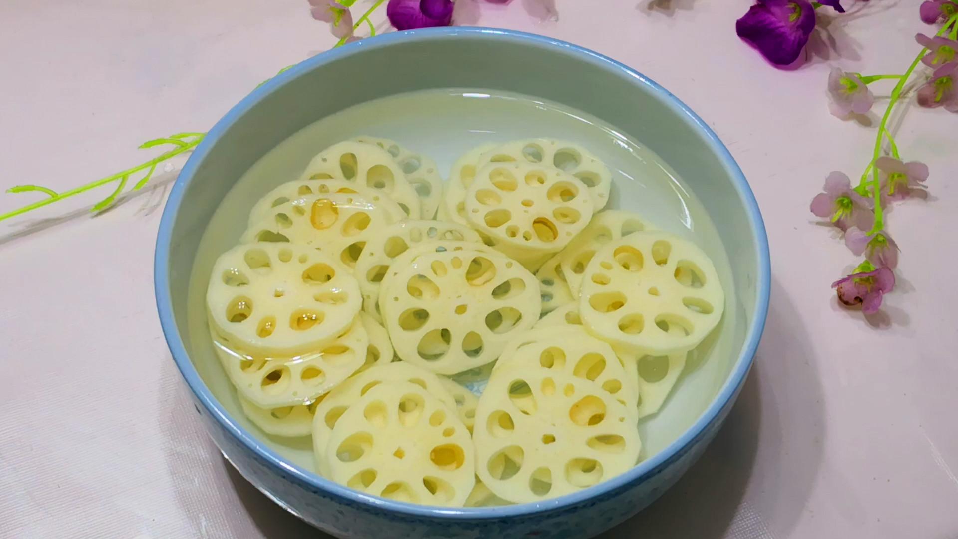1.蓮藕洗淨削去外皮後,切成連刀片,每兩片之間相連,不要切斷。藕片要儘量切得薄一些,然後放入清水浸泡備用,防止它氧化變黑。