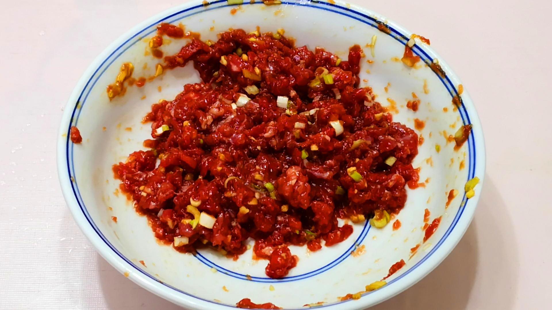 2.再取一小塊豬肉剁成肉餡,加入蔥薑蒜末、生抽和蠔油各1勺,食鹽和胡椒粉各適量,攪拌均勻後再磕入一個雞蛋清,加入少許澱粉,充分攪拌均勻後醃製15分鐘。