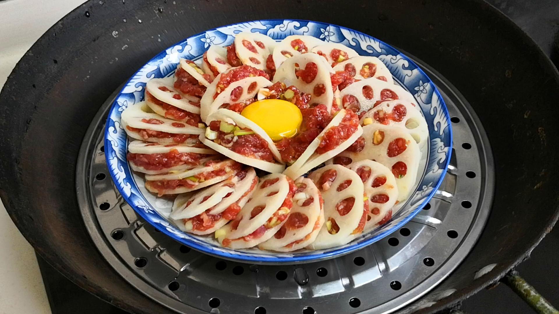 4.肉餡醃製入味後,將其夾入到蓮藕中,做好的藕盒擺入盤中,如果有剩餘的餡料,將其放在盤子的中間,然後把剩下的雞蛋黃也放到盤子中間,再放到蒸鍋中蒸。