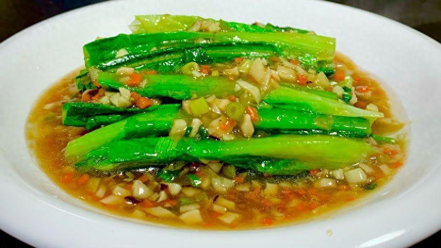 - 鍋中倒油,待油熱後倒入蒜末和辣椒段,炒出香味。接着放入 10 克蠔油,快速翻炒使其化開。先放入油麥菜的根部部分,炒至斷生後再放入葉部,快速翻炒,待油麥菜炒斷生後,放入 2 克食鹽、1 克雞粉,開大火快速翻炒,以使調料均勻化開。要注意食鹽不要放得過早,以免大量出水。最後淋入少許明油,即可裝盤食用。