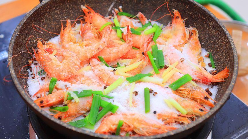 - 把鍋燒熱,倒入食鹽和花椒一起翻炒。待食鹽炒熱後,先盛出一部分,將剩餘的食鹽攤平,把蝦依次擺放在食鹽上面,再把之前盛出的食鹽均勻撒在蝦身上,接着把醃蝦用的蔥、姜也放入鍋中,蓋上鍋蓋開小火燜制 5 分鐘。