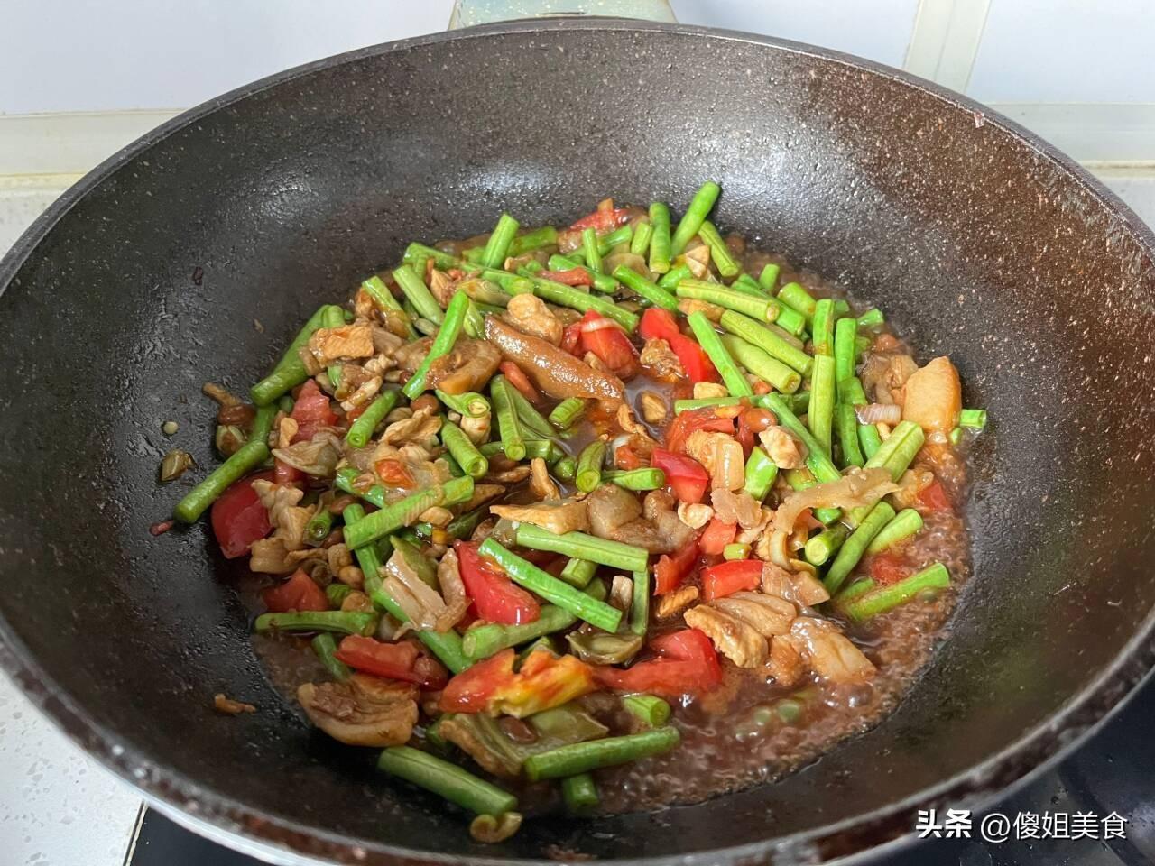 3、豬肉炒上色後把長豆角、西紅柿都放入炒鍋內不停的翻炒,把西紅柿的湯汁翻炒出來,隨後再往鍋中淋入適量的清水,水量要沒過食材。