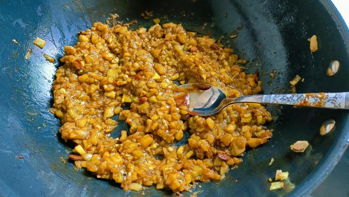 5.起鍋加稍微多一點的食用油,油微熱時加入兩勺黃豆醬,炒出醬香味後,再將茄子丁倒入,翻炒至茄子丁變軟後關火。