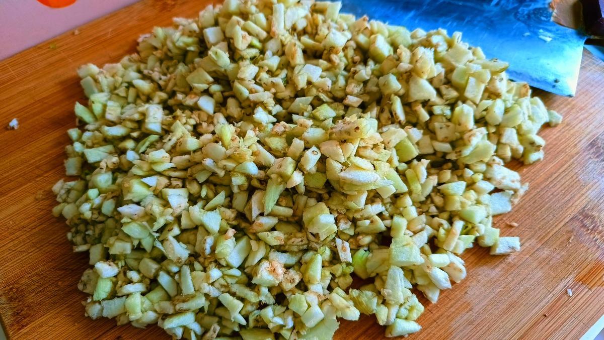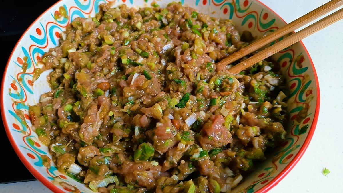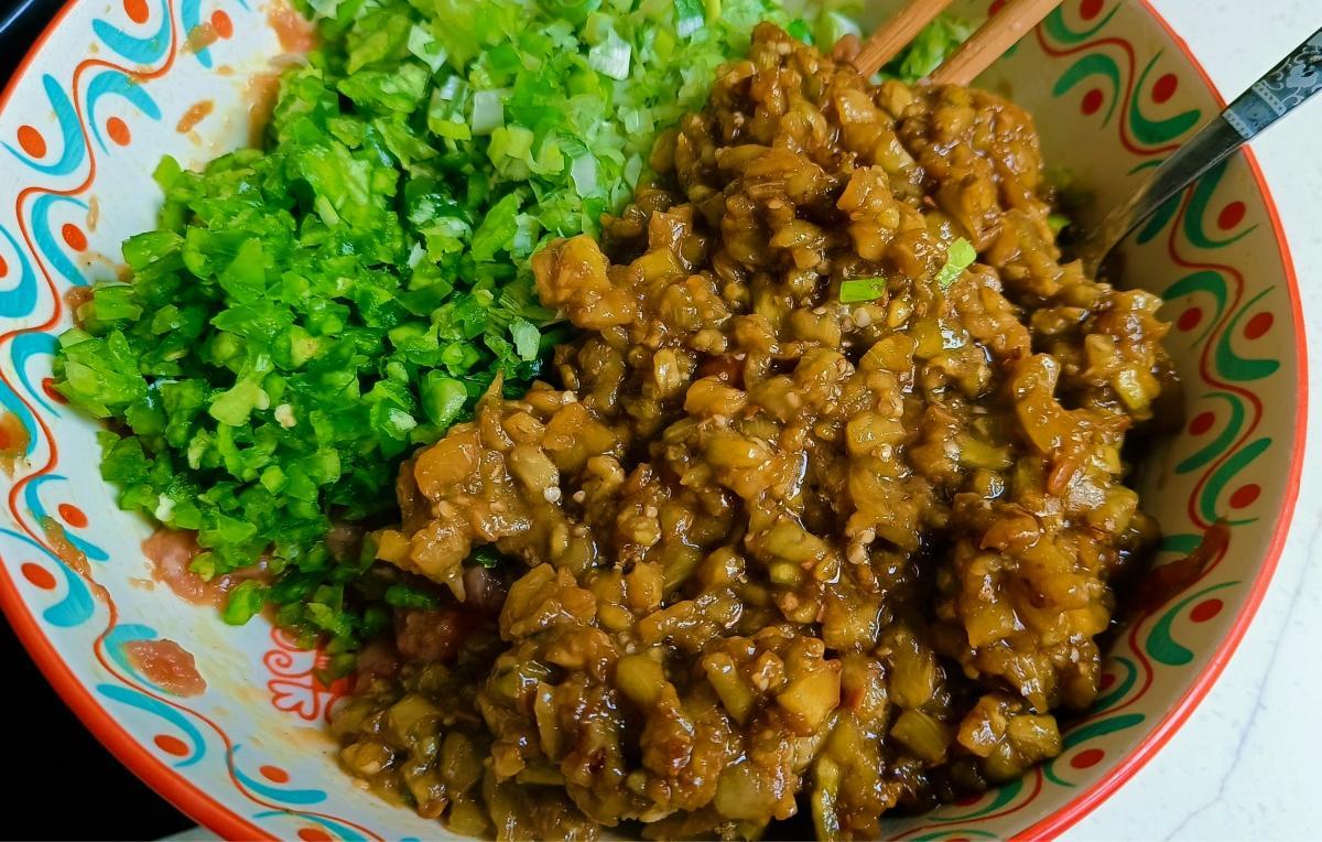 然後把炒香的茄子丁倒入到醃製入味的肉餡中,再把蔥花和青椒碎也倒入,然後加入適量薑末、食用鹽,攪拌均勻即可,好喫的茄子青椒豬肉餃子餡就調好了。