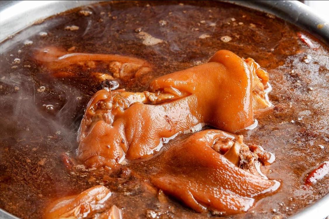 5、繼續用小火燉上1個小時以上,燉的時間越長,豬蹄的軟爛程度越高,燉到軟爛之後將蓋子掀開,把八角、蔥薑蒜等香料都挑出來,隨後往裏面加上適量的鹽調味,然後再開大火來收汁,將多餘的湯汁收幹後,就可以出鍋開喫啦,鮮香軟爛,Q彈勁道,還能補充膠原蛋白,趕緊買點嚐嚐鮮!