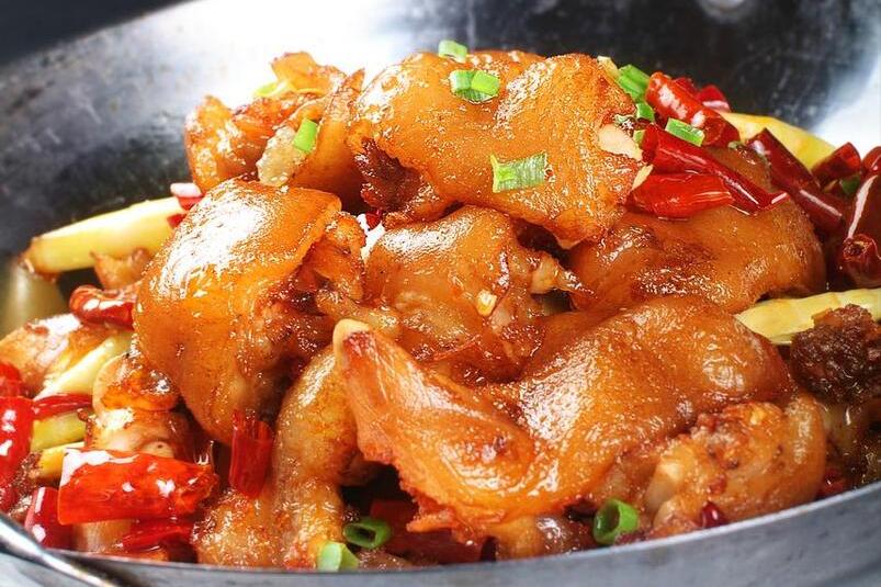 用到:豬蹄、八角、蔥薑蒜、幹辣椒、香葉、鹽、冰糖、料酒、老抽、紅燒醬油、食用油