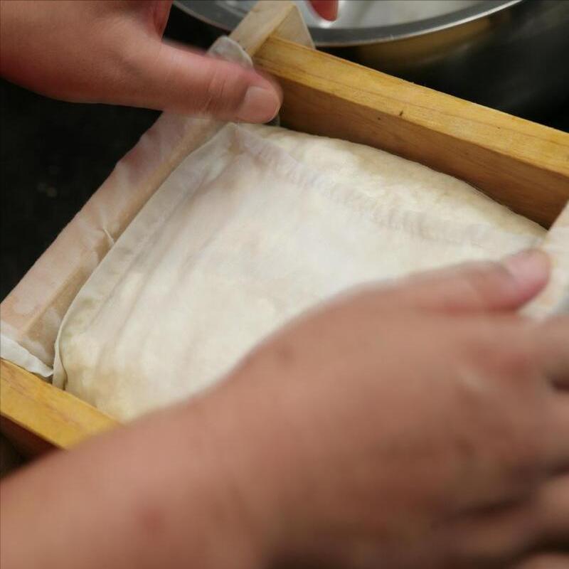 6、一點一點的往裏面倒,一邊倒一邊用勺子不停攪拌,都倒進去以後繼續攪動片刻,慢慢的就攪拌出豆花了。這個時候蓋上蓋子,靜置2個小時,然後將其倒入專業的模具中,保證下面可以滲水即可,上面壓上重物,繼續靜置2個小時以上,豆腐就定型了,拿出來開喫!