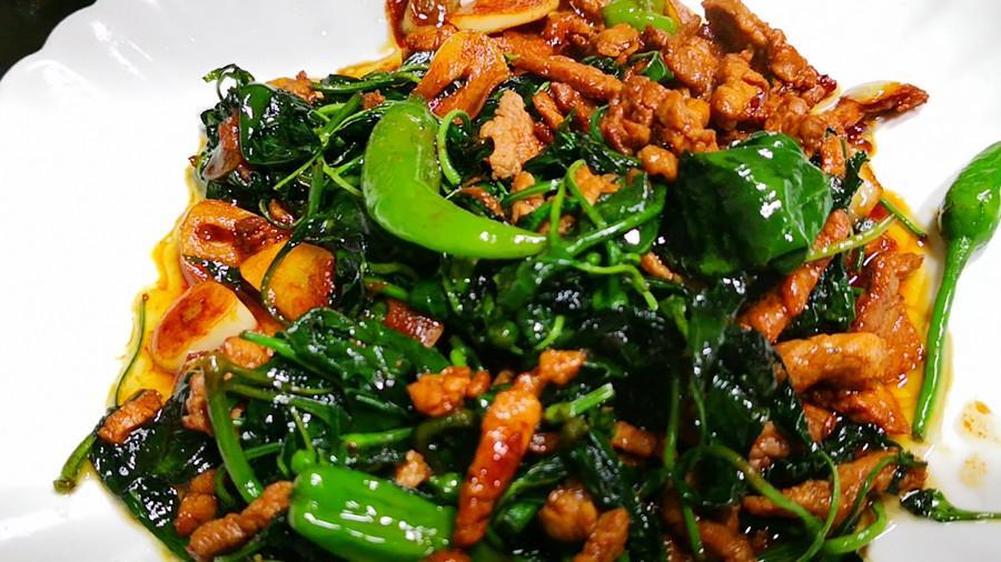 3、起鍋加油,油溫五成熱下入肉絲,大火翻炒,炒至肉絲變色後加入蒜片,蒜片爆炒出香味後倒入辣椒葉,翻炒均勻後開始調味,加入適量的食鹽、白糖和少許生抽,翻炒均勻化開調料後關火,出鍋裝盤即可,辣椒葉這樣簡單一炒,又鮮又香又下飯,特好喫!