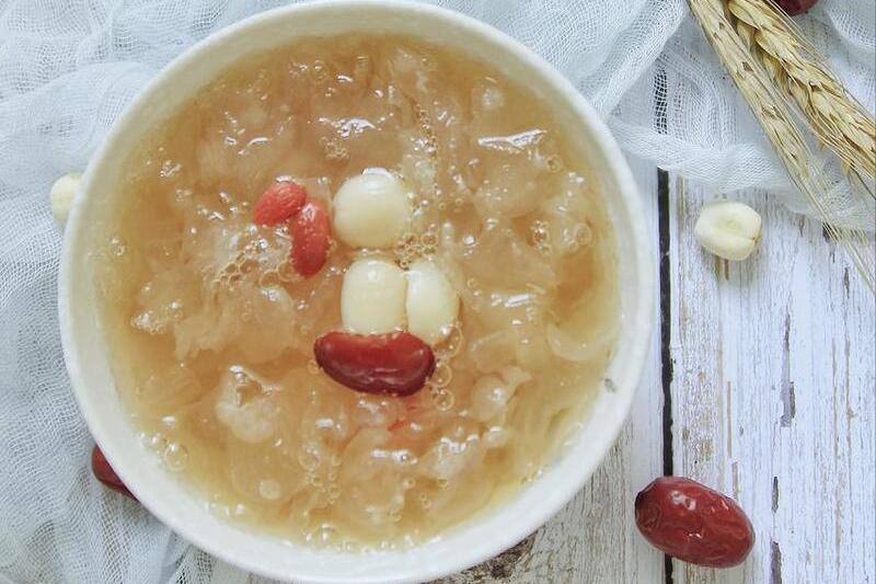 銀耳泡發撕碎後,倒入鍋中,蓮子、紅棗、冰糖也一起倒進去,隨後添上清水開始煮。大火燒開後,小火燉40分鐘以上,直至將銀耳煮到軟爛、黏稠之後,放入枸杞攪拌均勻,出鍋開喝。