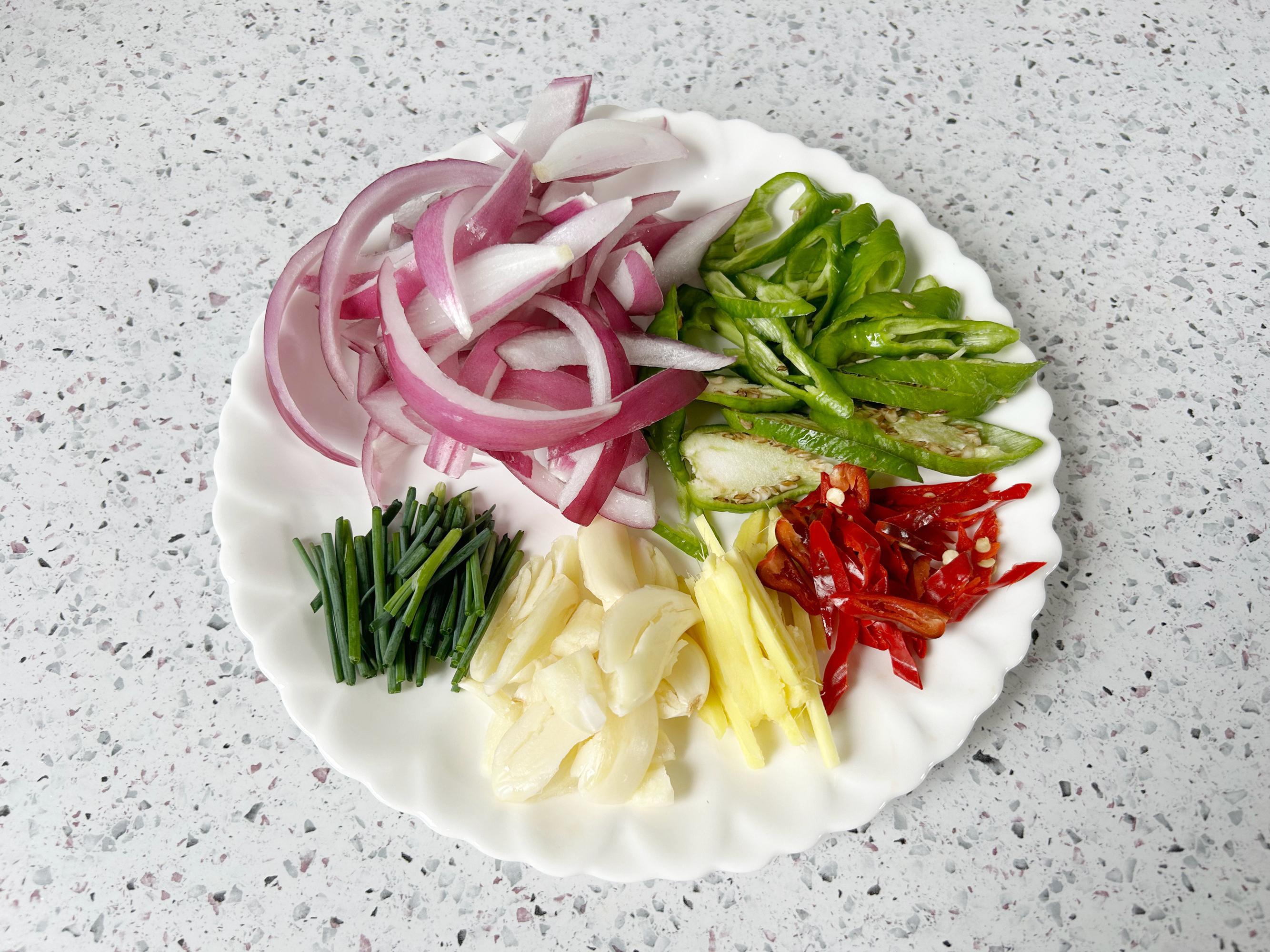洋蔥切細長條,青椒斜着切絲,紅辣椒同樣斜着切絲,生薑去皮切絲,大蒜拍扁去皮,香蔥切長段。