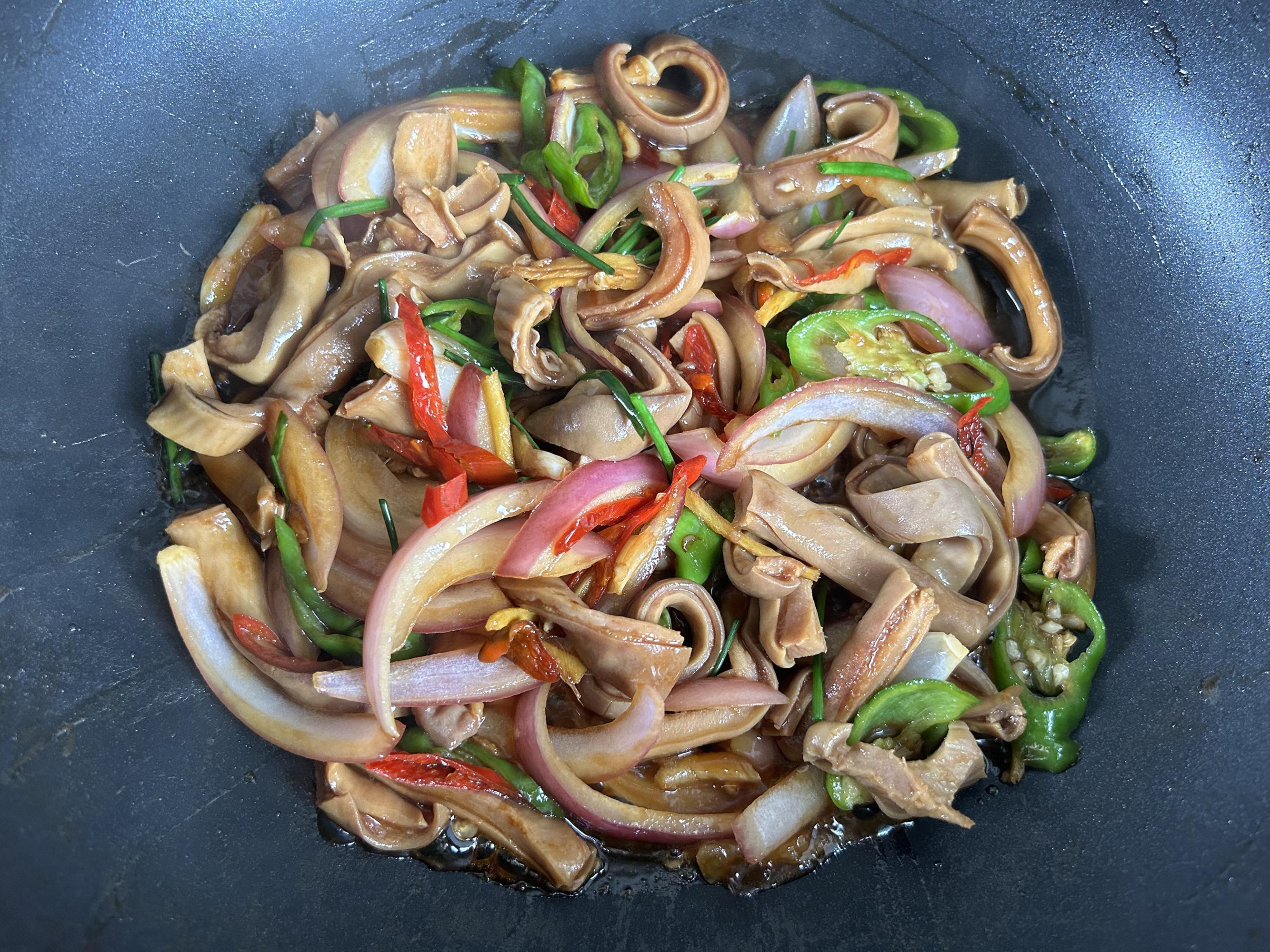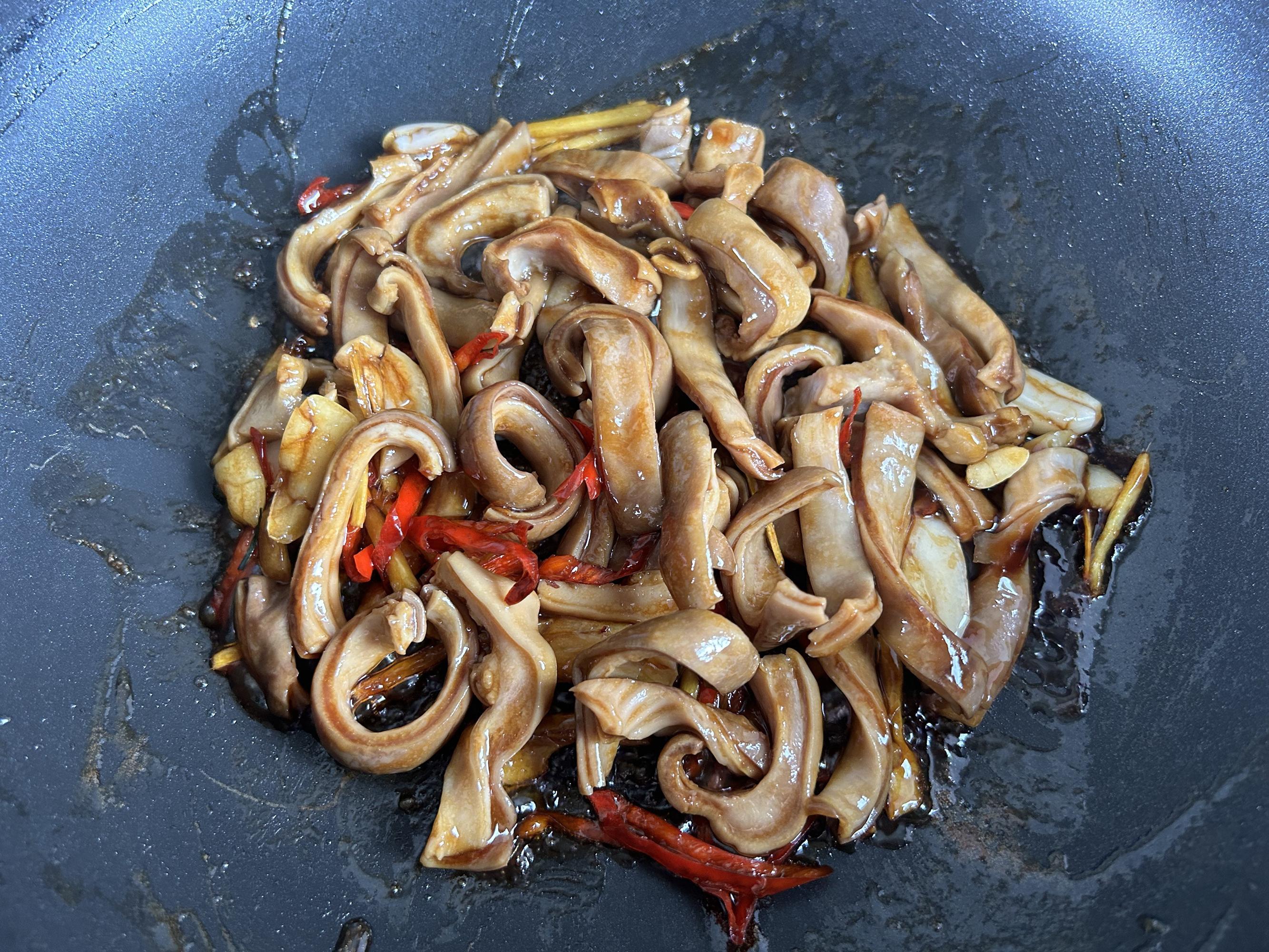 加入燉好的豬肚翻炒均勻,加入蒸魚豉油和蠔油,翻炒均勻。