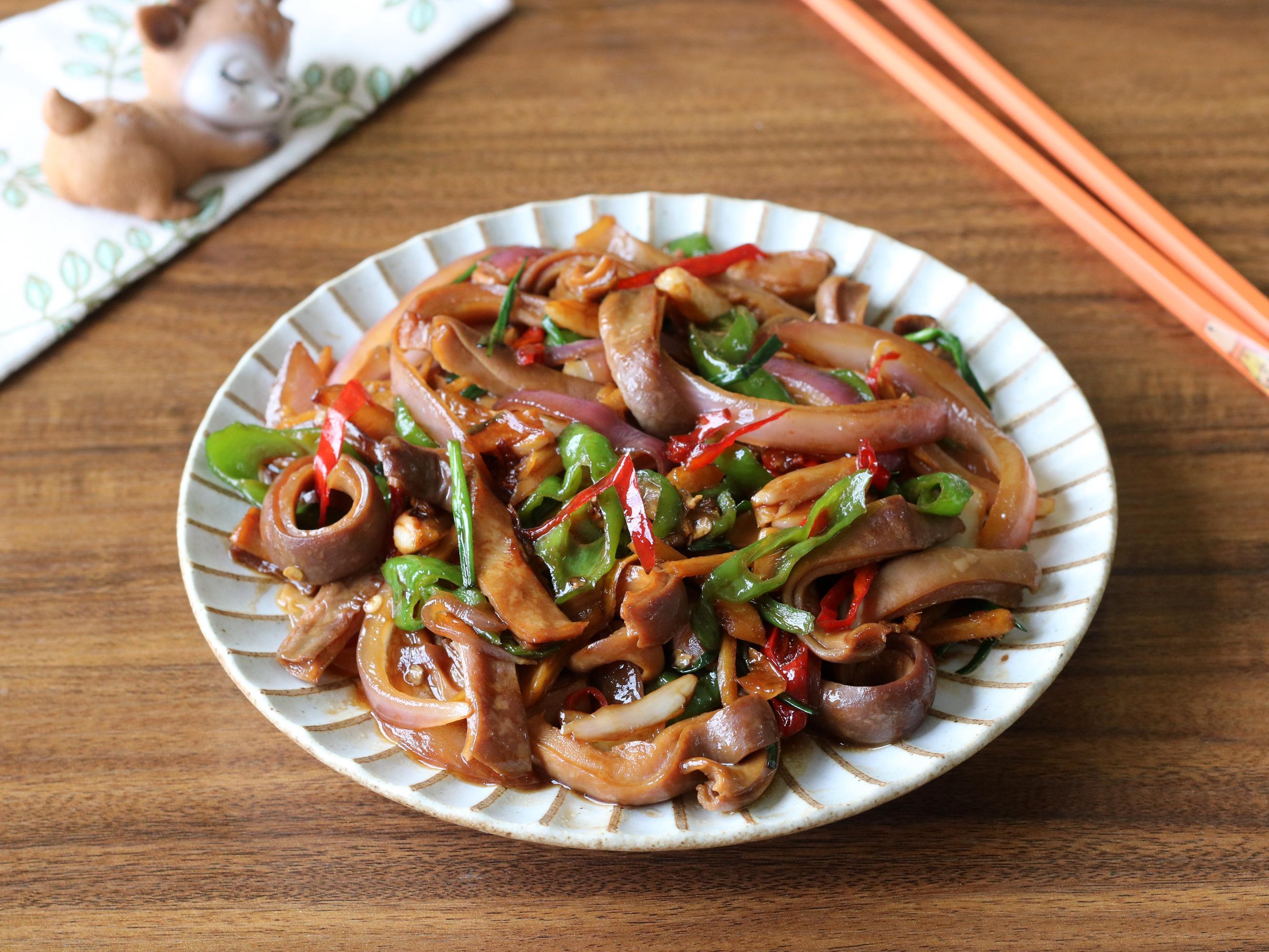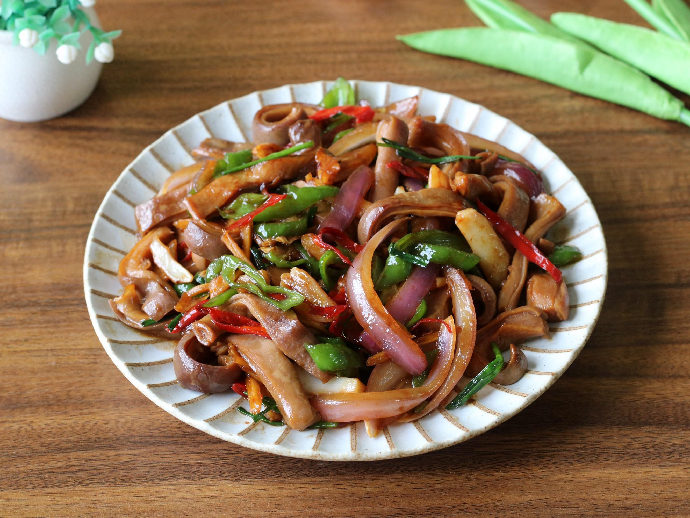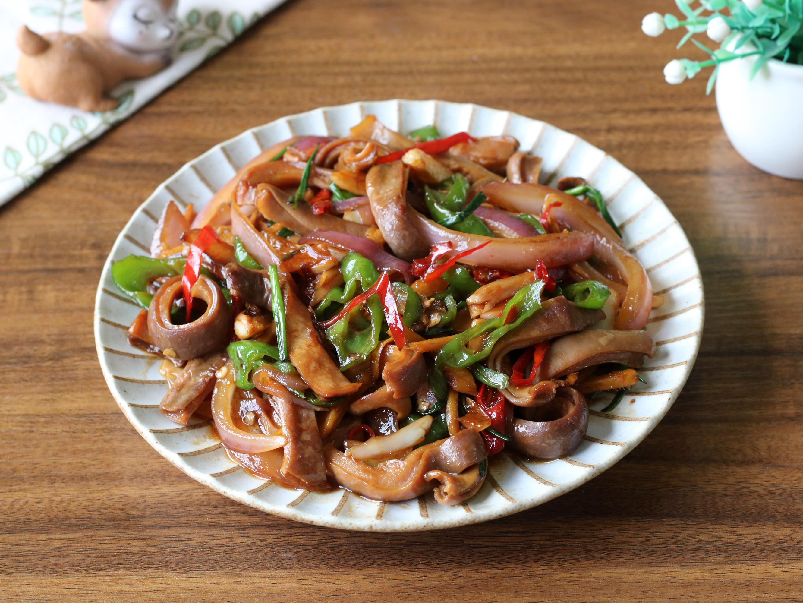 加入青椒和洋蔥,翻炒到熟透,一道營養好喫的爆炒豬肚就做好了。蒸魚豉油和蠔油都有鹹味,一般來說就不需要加鹽了。