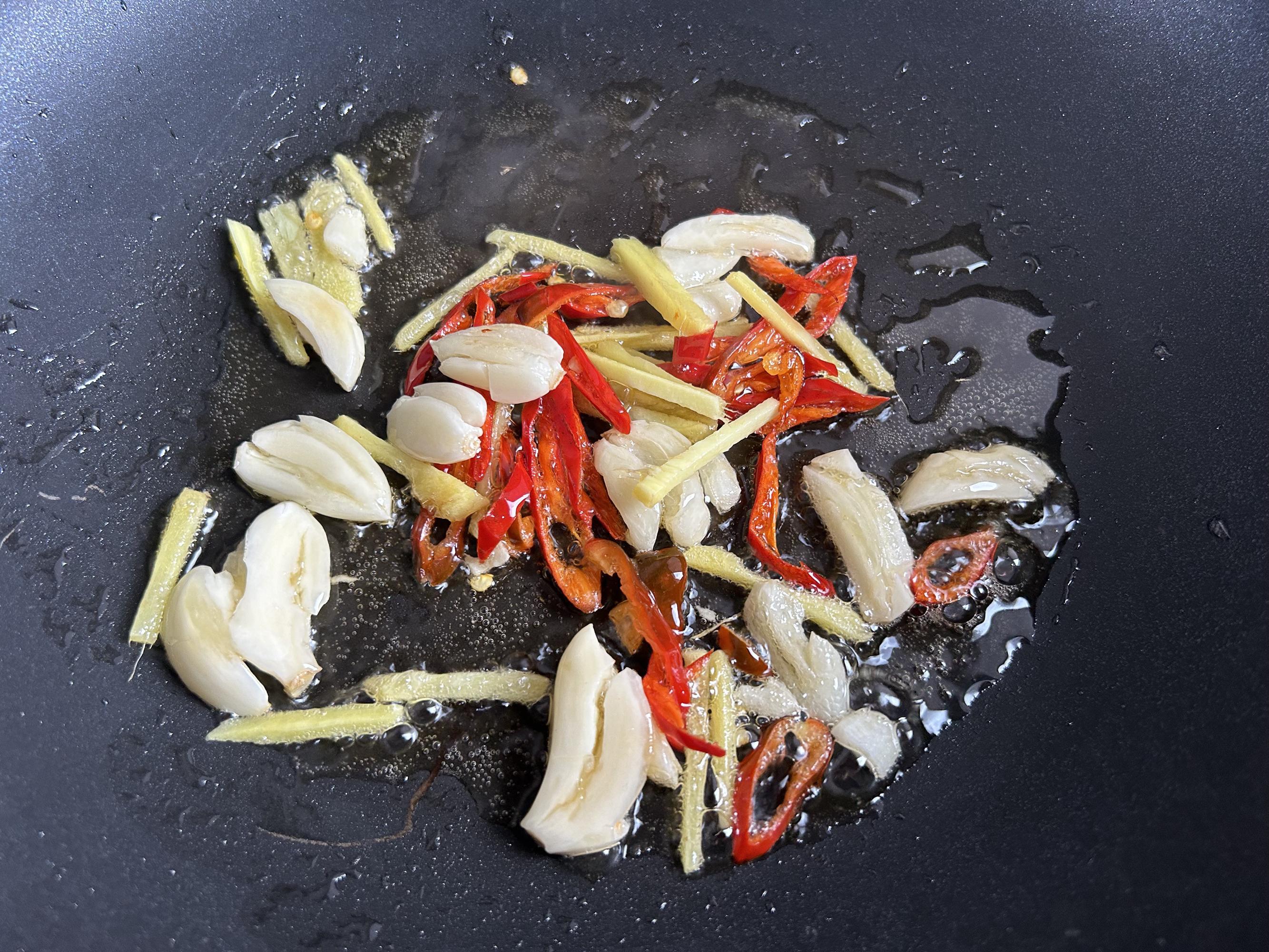 熱鍋放油,放入薑絲、大蒜和紅辣椒,翻炒出香味。